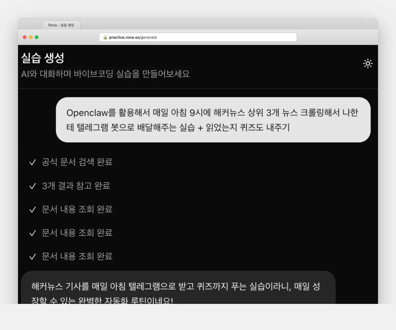 2. AI가 실습 생성: 실제 Rona 파이프라인을 통해 실습을 만듦