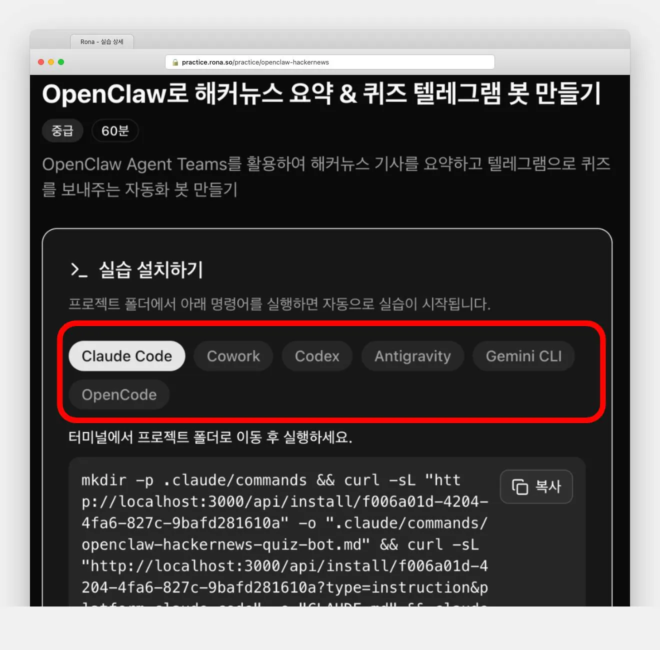 • Rona 플랫폼: 강사 채팅 → 실습 자동 생성 → 공유 링크 → 학습자 원클릭 설치