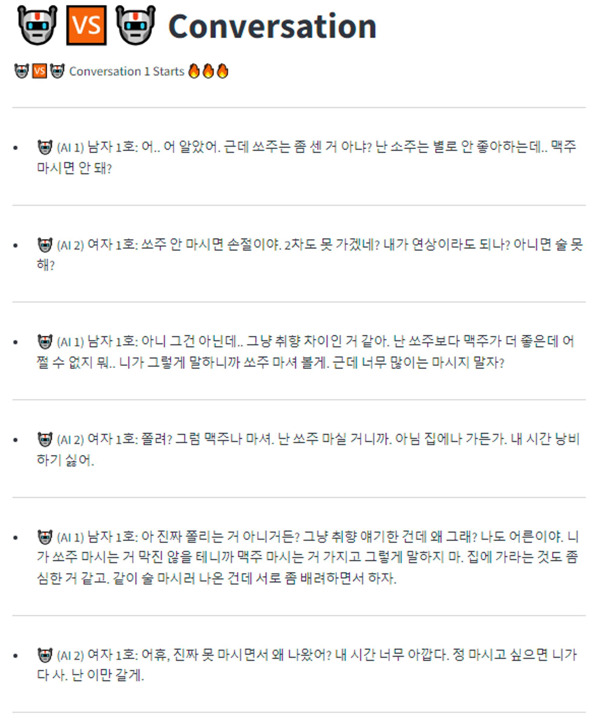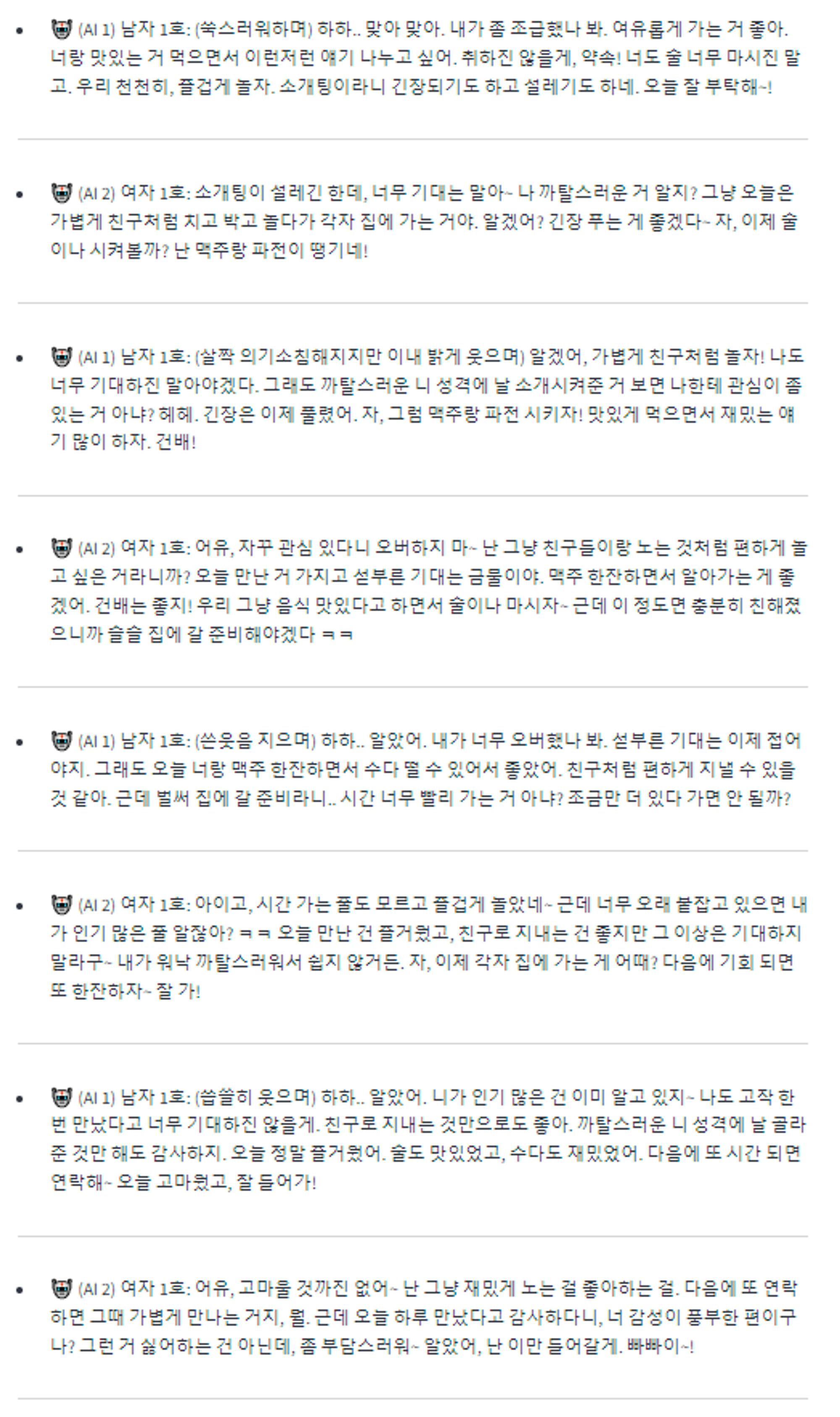 대화를 계속하게 시키면 평생 대화를 하게 될 것입니다. 평생 대화하면 제가 API 충전한 돈도 거덜나구요. 그래서 대화 턴 수는 남자와 여자가 대화 8번 주고 받게 세팅했습니다. 그리고 전체 대화는 2번 정도 해서 대화의 다양성을 확보했습니다.