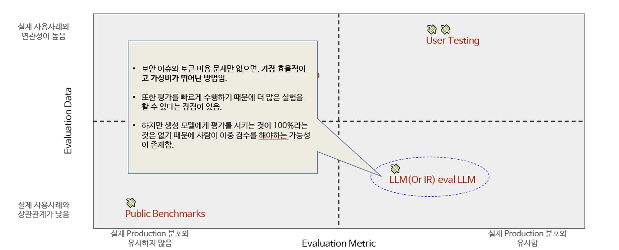 x, y축으로 실제 데이터와 측정할 수 있는 Metric에 따라서 전략이 나뉘는데, 결국 정성적인 요소가 반드시 들어갈 수 밖에 없습니다. 오히려 정성적인 영역을 정량적으로 문제정의하는데 cost가 가장 많이 듭니다. 우선, 아래 그림은 총 4가지 영역으로 공개된 벤치마크로 평가하거나, 인간 평가, LLM 평가, 유저 테스팅 4가지 영역이 있습니다. (아래는 제가 어디 다른데서 강의했던 장표)