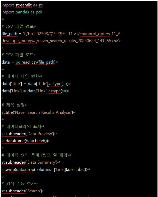 A >> 이제 이 데이터를 Streamlit을 이용하여 웹 애플리케이션 형태로 시각화할 수 있도록 코드를 작성해보겠습니다. 이 애플리케이션은 CSV 파일의 데이터를 표시하고 기본적인 데이터 탐색 기능을 제공합니다.