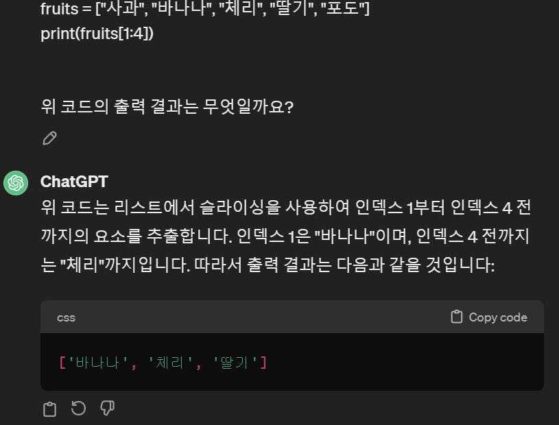 fruits[1:4]가 뭔지 몰라서 vscode에 넣고 바로 돌렸습니다