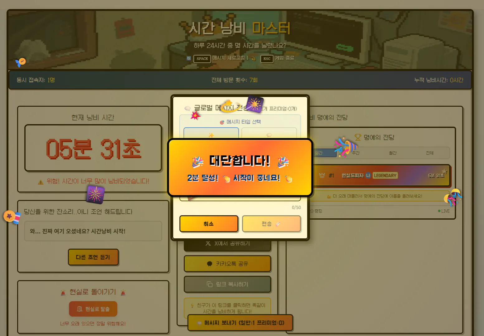 ๊ฒฐ๊ณผ: timetrash.net - "์๊ฐ๋ญ๋น ๋ง์คํฐ"๋ผ๋ ์ค์๊ฐ ๋ฉํฐํ๋ ์ด์ด ์น๊ฒ์์ ์ฑ๊ณต์ ์ผ๋ก ๋ฐ์นญํ์ต๋๋ค! ๐