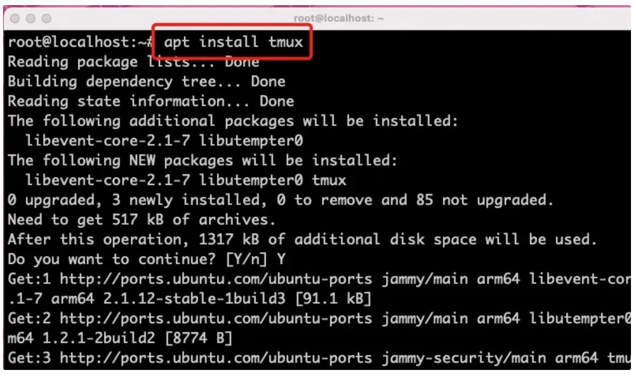 작업 수행하고 나서 ctrl+b 누르고, detach 입력 하면 세션을 빠져나옵니다. 세션은 백그라운드로 전환되어 작업이 종료되지 않습니다.