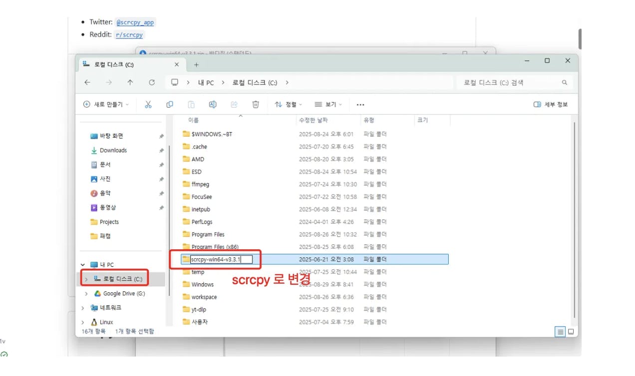 C:\scrcpy 폴더로 압축해제된 파일 저장