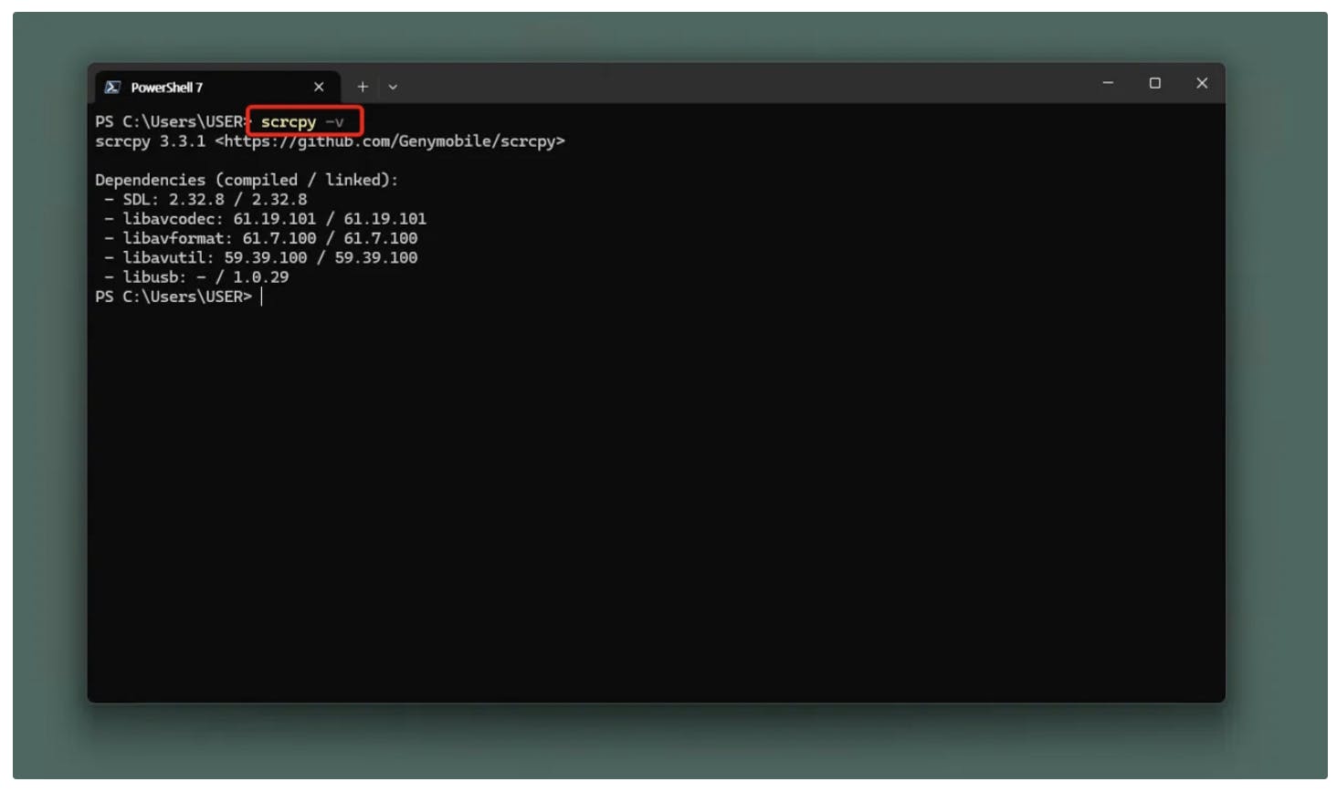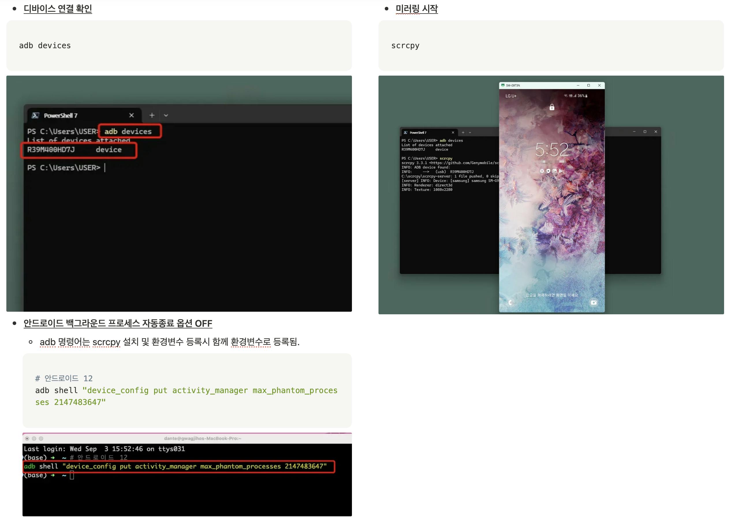 brew install scrcpy brew install android-platform-tools` # 또는 (Homebrew 버전에 따라 다릅니다) brew install --cask android-platform-tools터미널을 재시작하고 설치 여부 확인