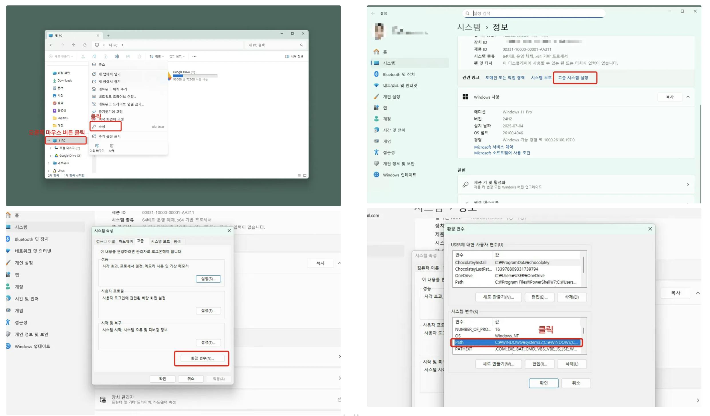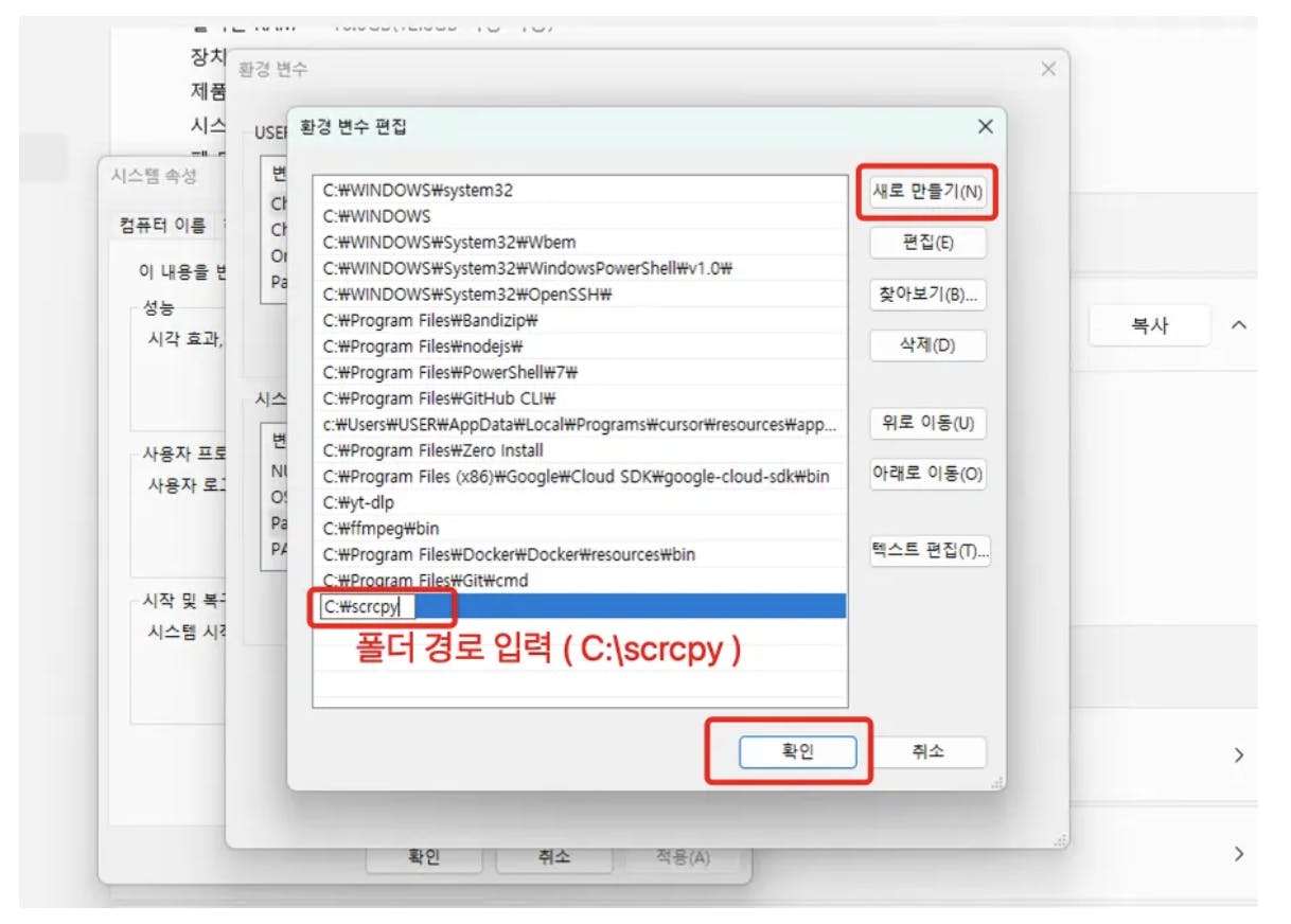 다운로드 받은 scrcpy를 터미널 전역에서 사용할수 있도록 환경변수를 아래 절차대로 등록합니다.