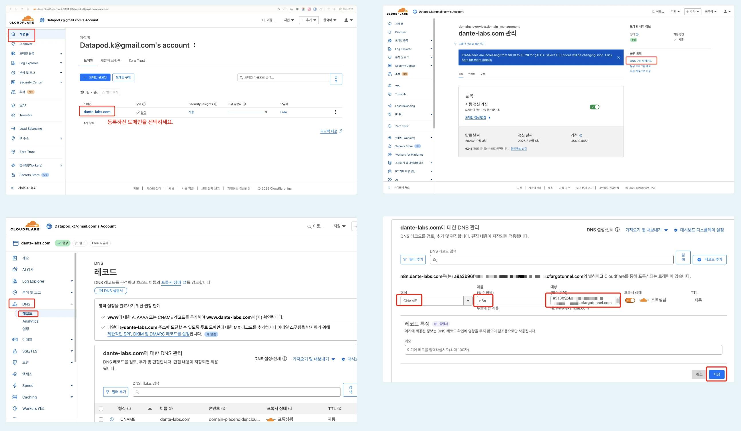 Cloudflare 도메인을 등록한뒤, 수동으로 서브도메인을 생성된 cloudflare 터널과 연결하는 방법입니다.