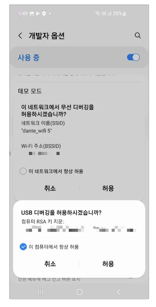 USB로 내PC에 연결합니다. 연결하면 USB 디버깅 허용 여부를 물으면 허용 버튼을 누릅니다.