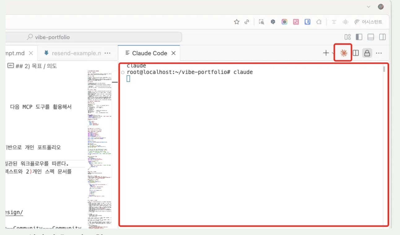 우상단 클로드 버튼을 누르면 편집탭이 열리면서 자동으로 claude code가 실행됩니다.