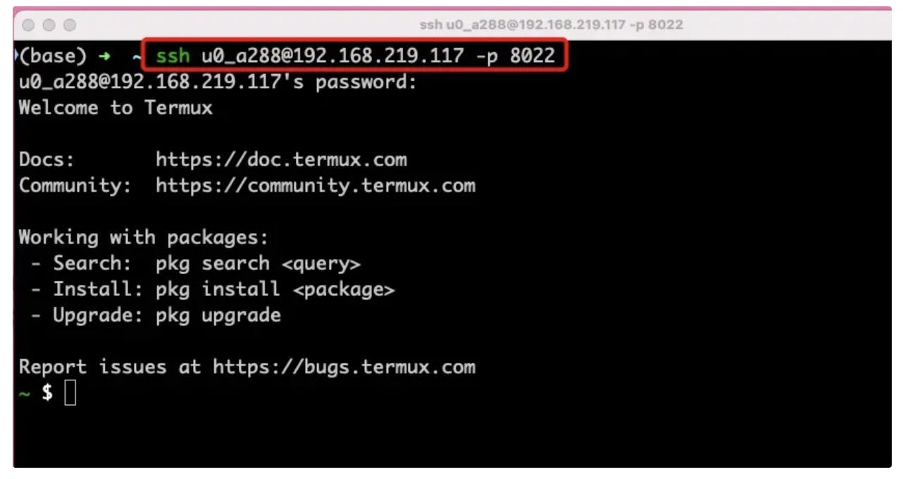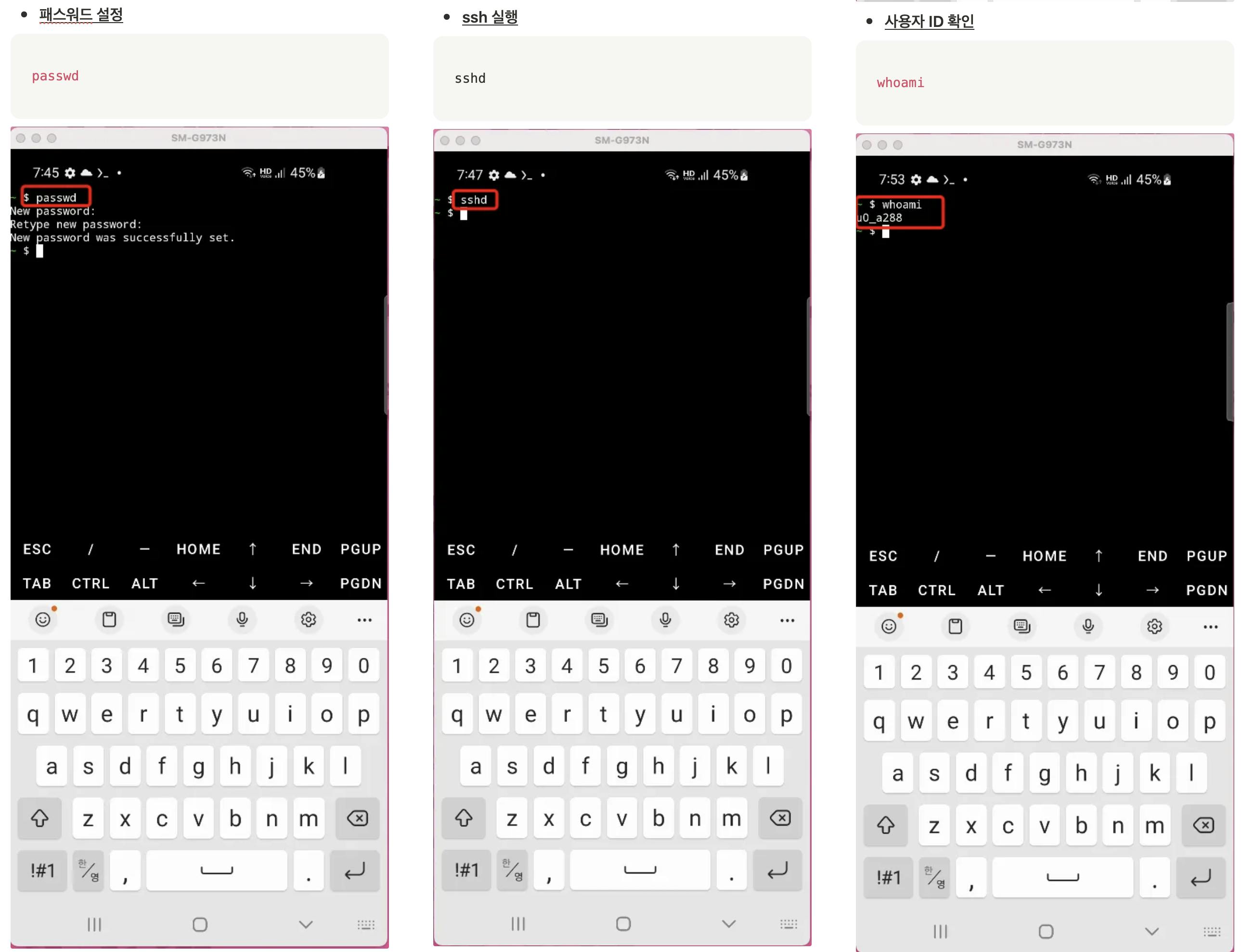 whoami로 확인한 ID로 접속합니다.ssh [사용자ID]@[프라이빗네트워크주소] ex) ssh [email protected] # 여기서는 u0_a288과 192.168.219.117이니 여러분의 주소에 맞게 수정하세요. # 명령어 입력후 암호 입력합니다.