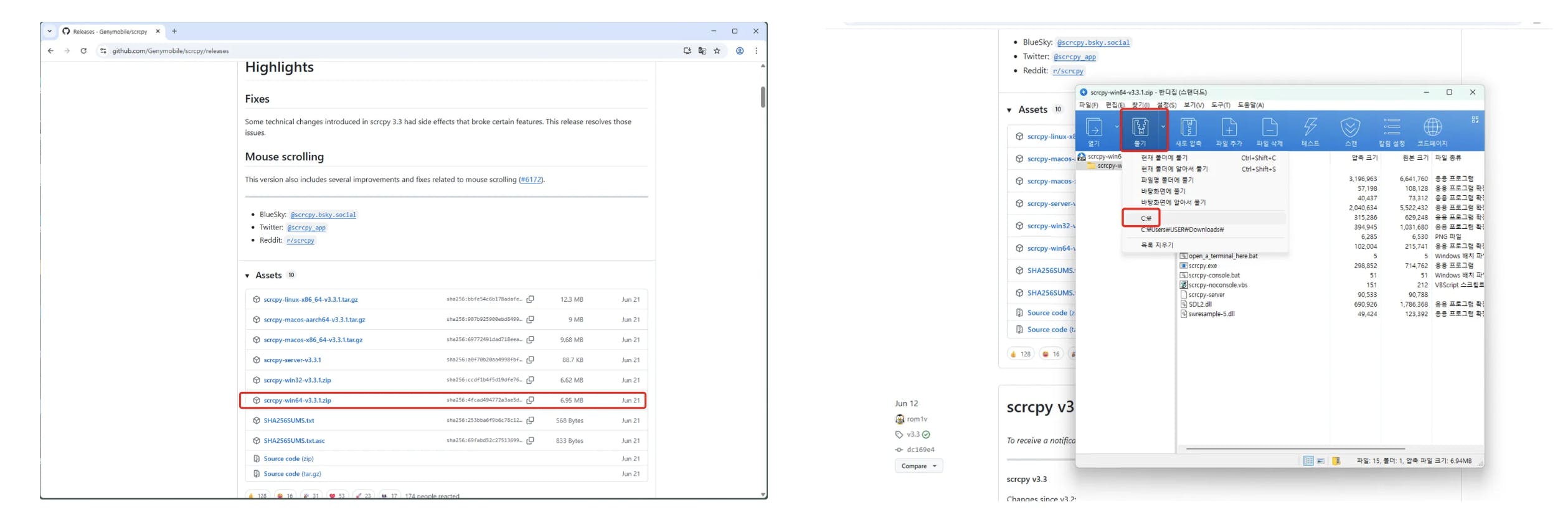 공식 배포 사이트에서 scrcpy 다운로드 (다운로드 링크)