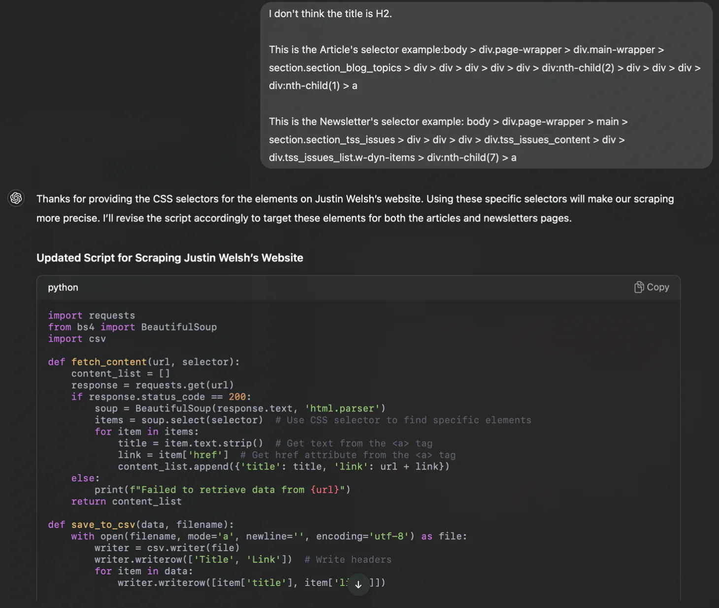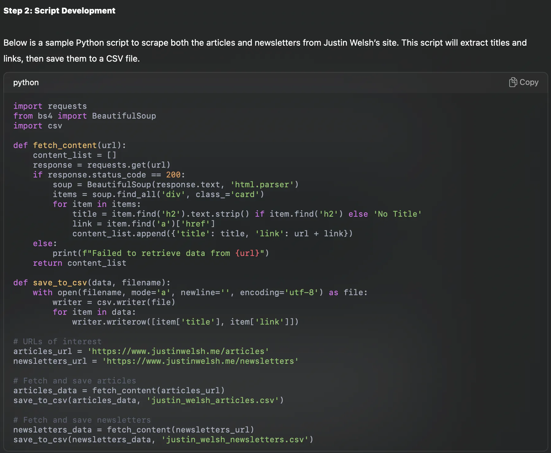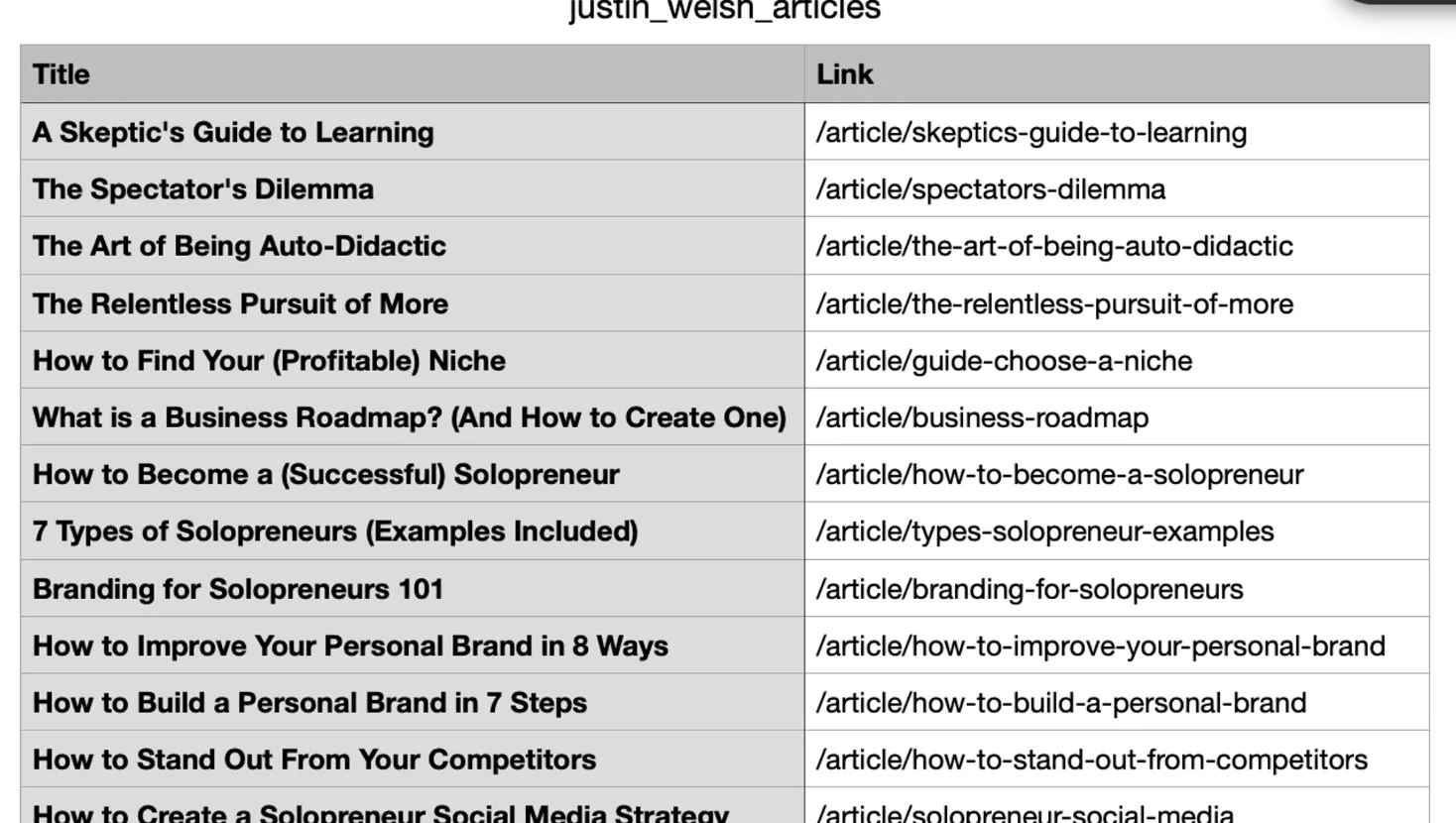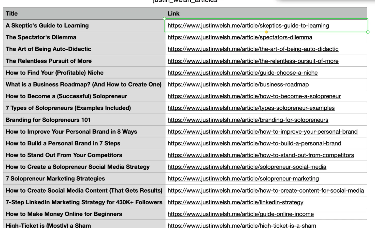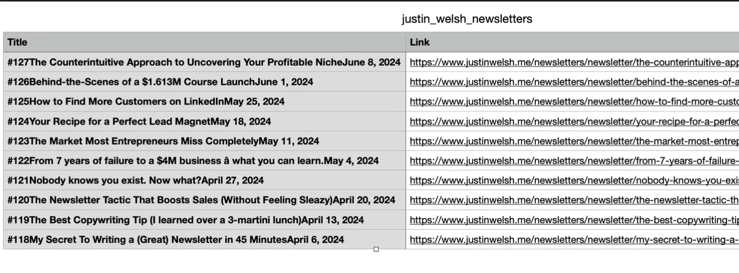 솔로프리너들 사이에 유명한 Justin Welsh의 뉴스레터와 아티클 크롤링 후 리스트 CSV파일로 받기