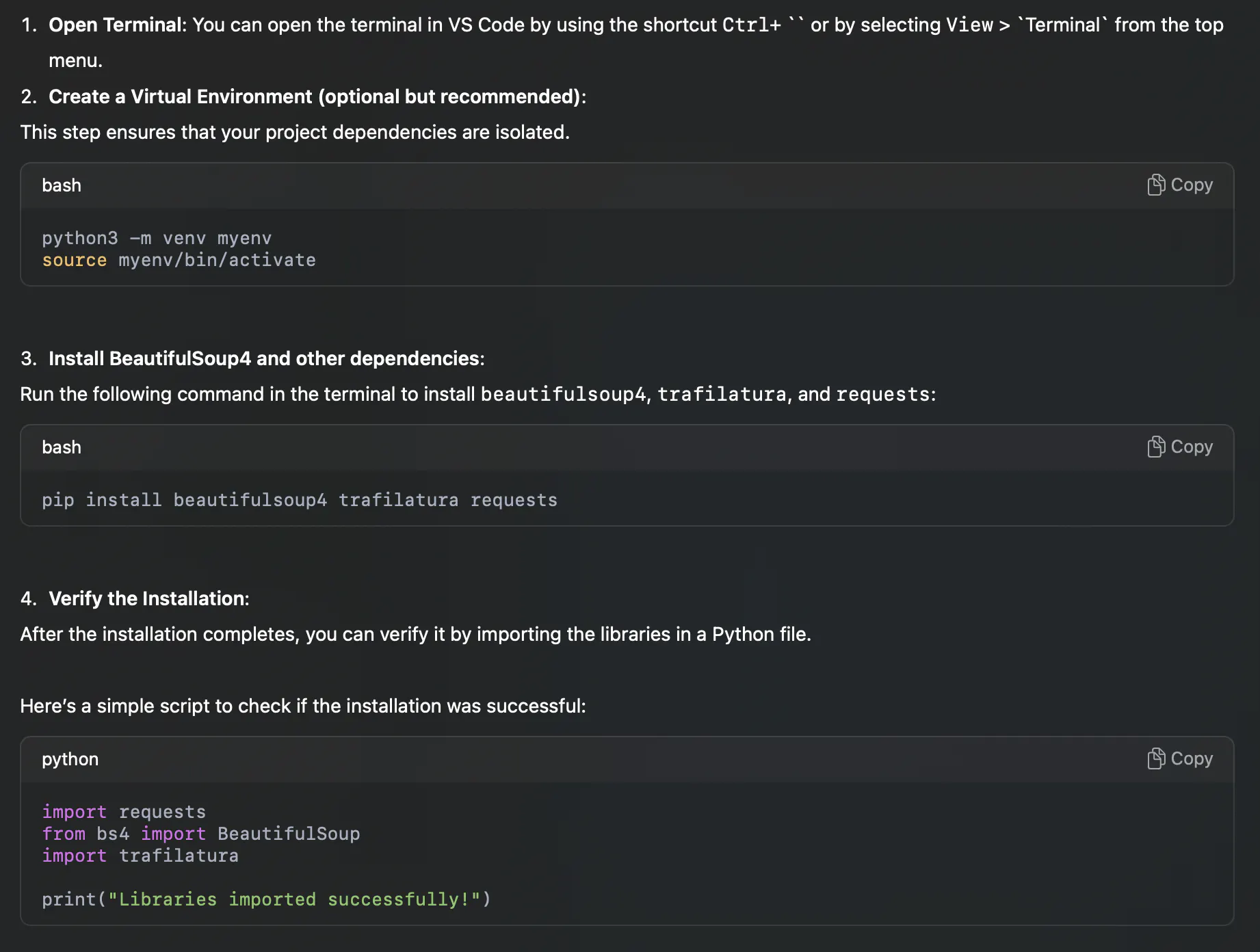 오티때 실습한 Trafilatura가 아닌 BeautifulSoup를 사용해서 VS Studio에 설치 후 진행했습니다.