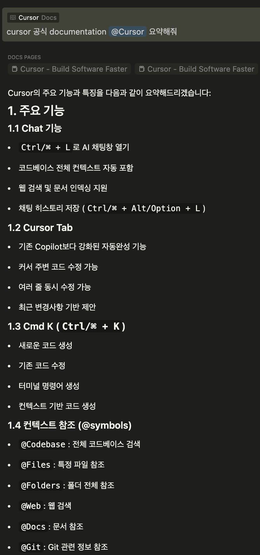 Cursor라는 툴 자체가 급속도로 발전하고 있는지라, 최신 기능들 중 공식 문서에 추가되지 않은 것들이 있습니다