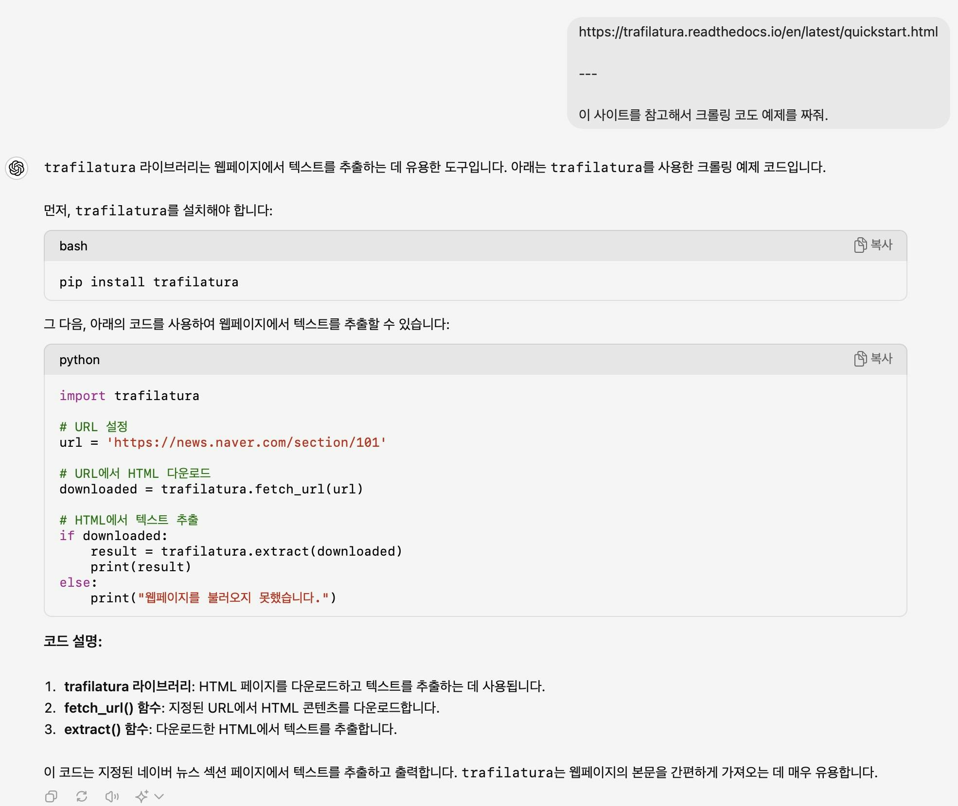 그 중 Trafilatura 실습을 해보았는데 저의 사용환경은 MAC 환경이어서