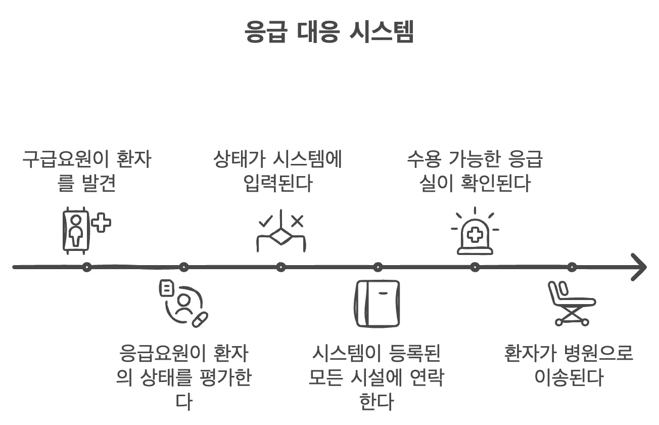 그렇다면 구조요원은 단 1번의 행동 만으로 모든 응급실의 수용 가능 여부를 알 수 있어 골든타임을 지키고 환자의 생명을 지킬 수 있을 겁니다.