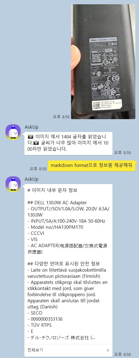 노트북 어댑터에 잘 모르는 전자정보를 이렇게 써져있어서, 이게 뭔가~ 하고 물어봤습니다. 이렇게 모르는걸 설명받을 수 있습니다. ( 다만 틀릴 수 도 있어요!! )