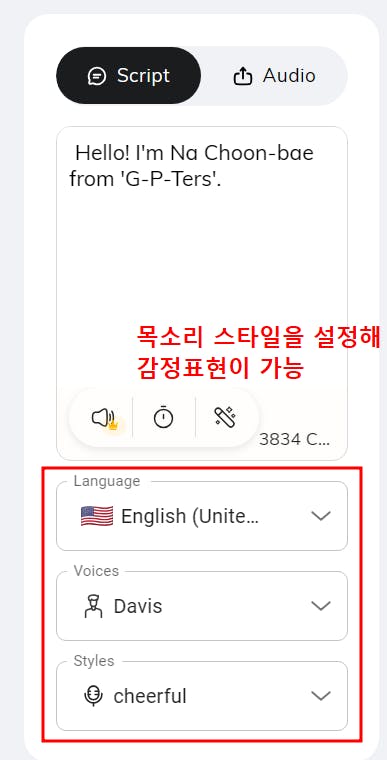 성우를 선택하고, 목소리로 감정표현을 할 수 있습니다.