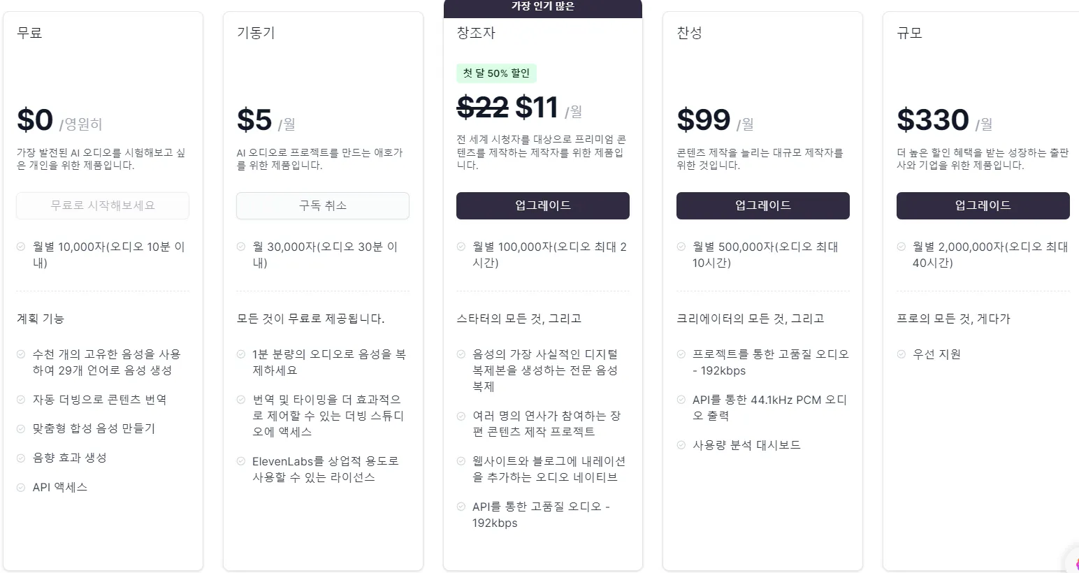 월 5달러인 스타터까지는 일레븐 랩스에서 제공하는 자동 목소리로 매칭 되지만