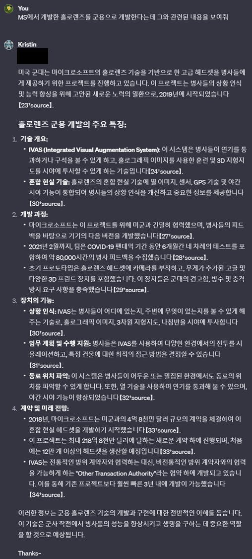 마침 마이크로소프트에서 군용 IVIS를 개발하고 있다고 해서 그 내용도 물어봤습니다. 재작년에 컨설팅 할 때 GPT가 있었으면 개고생 안했을 것 같다는 느낌적인 느낌을 팍팍 받았네요.
