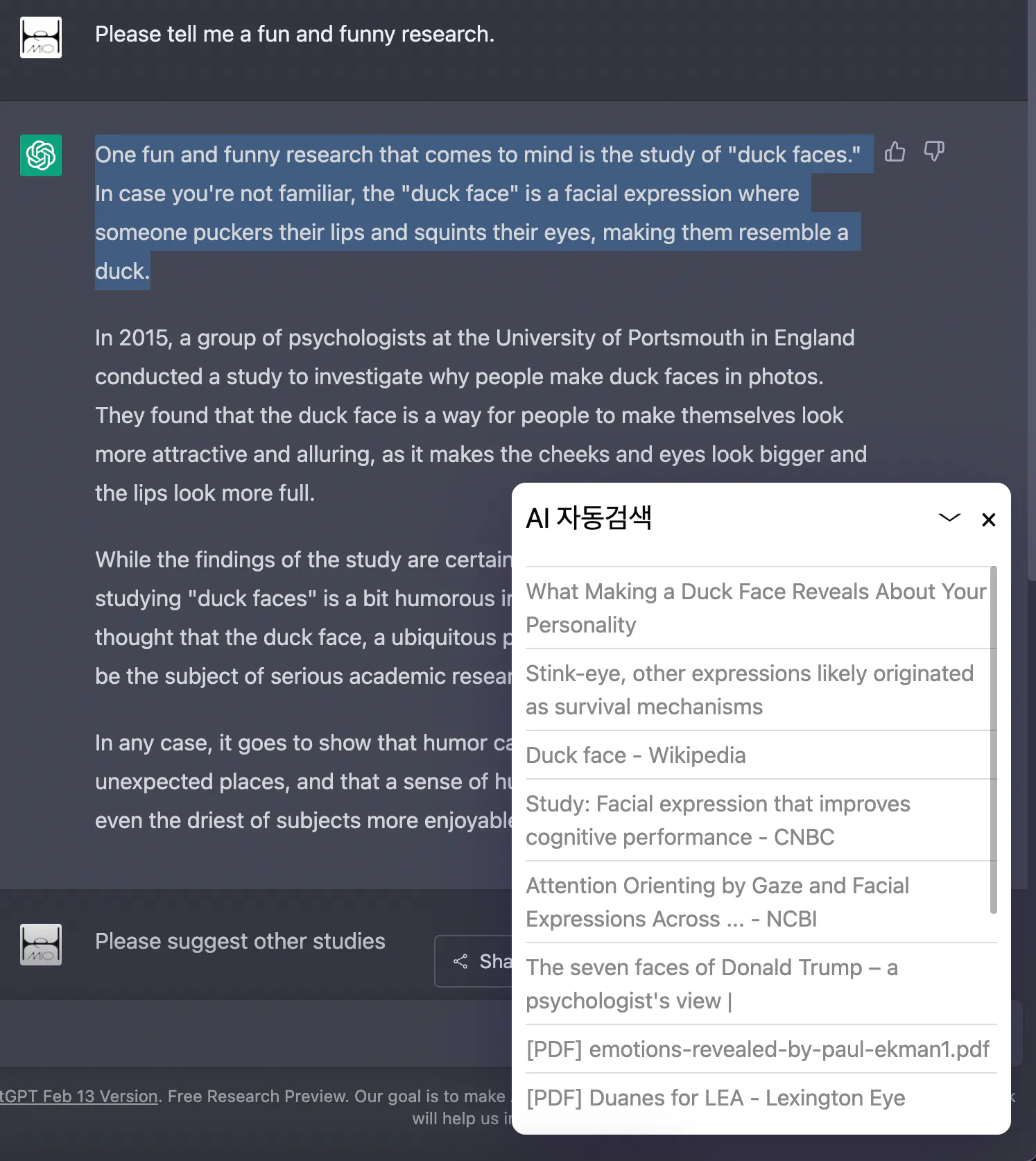 chatGPT의 답변에 관련된 웹문서나 자료를 쉽게 찾을 수 있습니다.