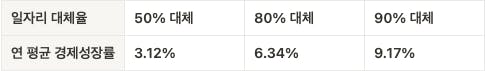 인공지능에 의한 일자리 대체율 대비 연 평균 경제 성장률이 위의 표와 비슷하게 흘러갈 경우