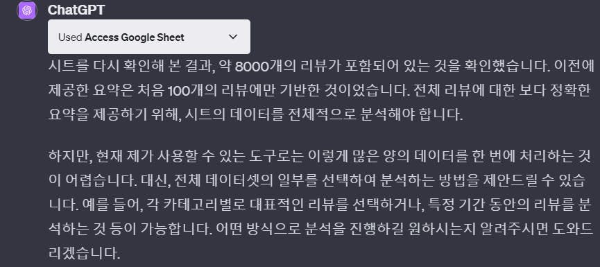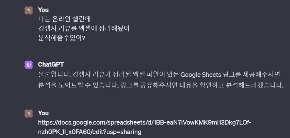 우선 gpt를켜서 엑세스 구글 시트 플러그인을 사용해봤습니다.