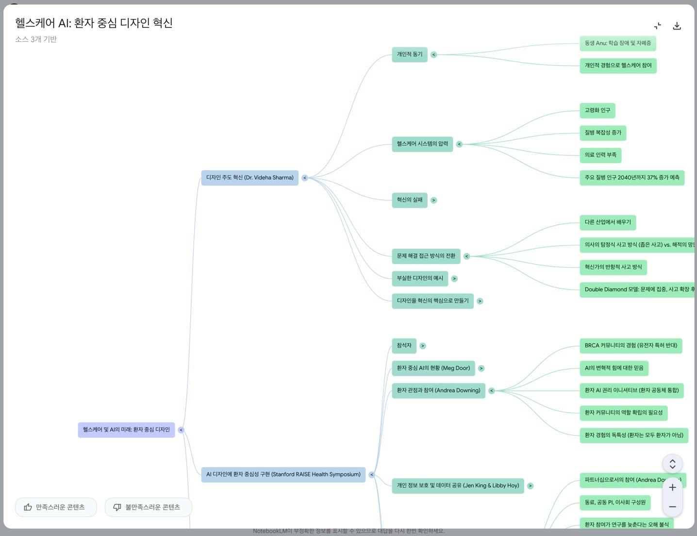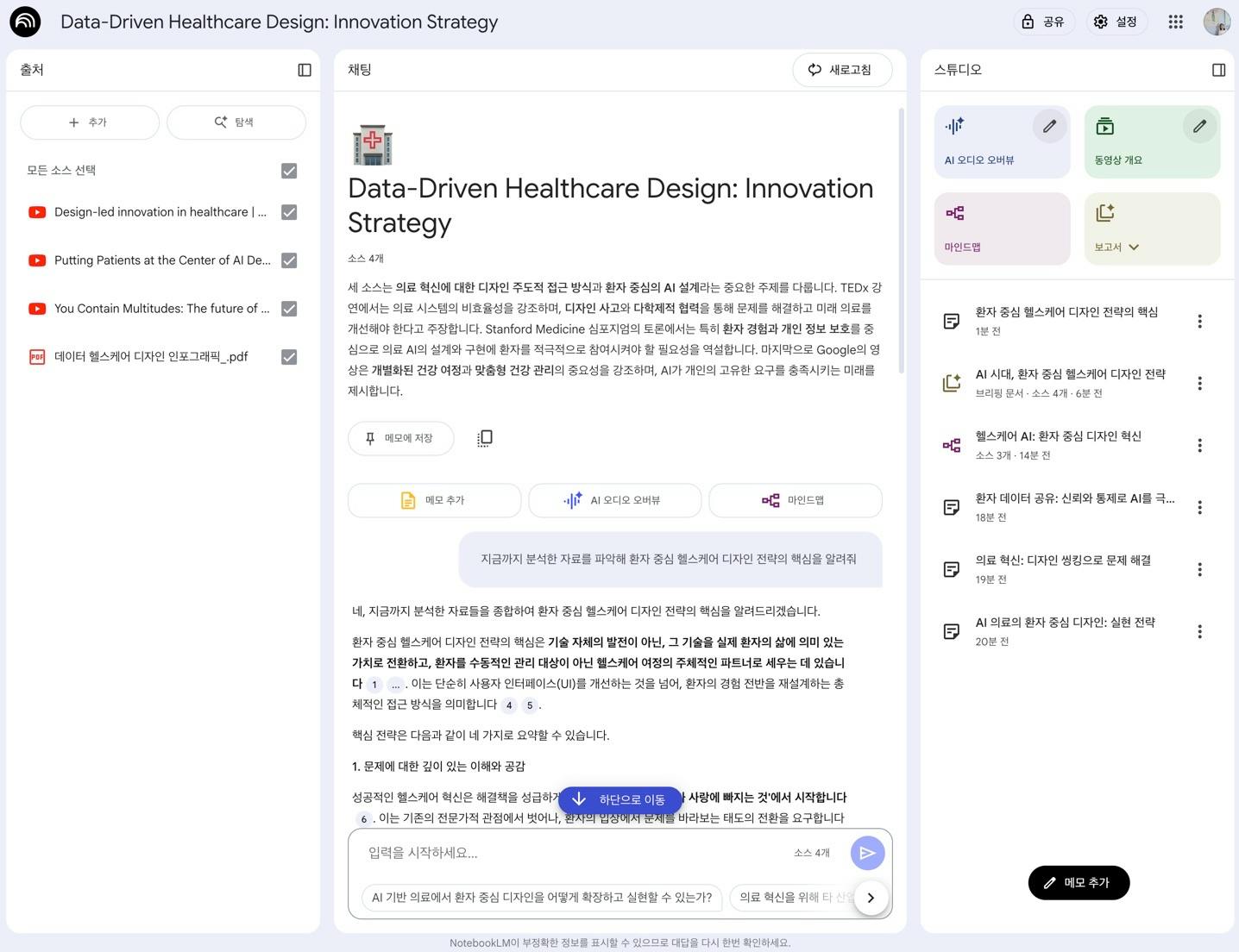 NotebookLM을 이용해 환자 중심 AI 디자인 적용 방안에 대한 주제 관련 소스(유튜브, 딥리서치 결과물PDF)를 추가해 메모 생성, 마인드맵, 브리핑 문서를 생성했습니다.