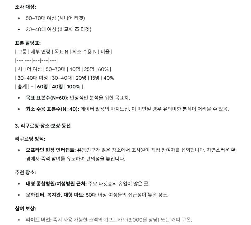 - 목표 표본수(N=50~80, 최소 수용 N=30), 50–70대 시니어 여성과 30–40대 여성으로의 층화/할당 표본 설계