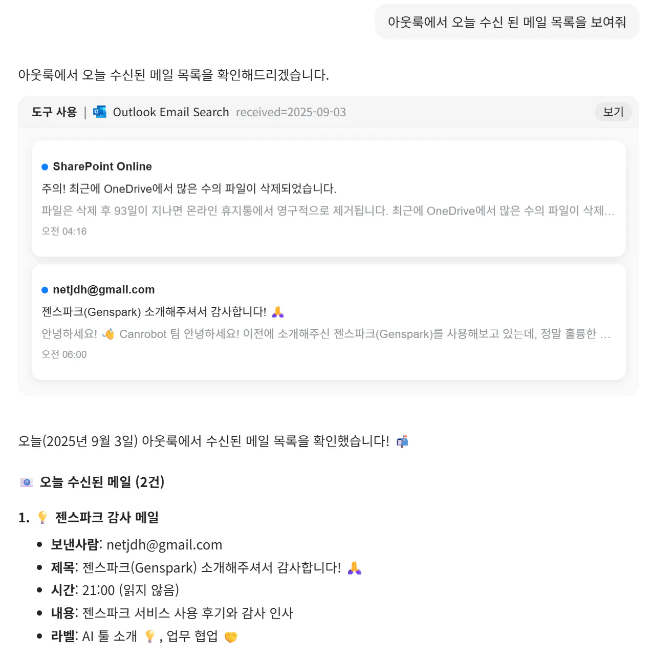 • 📬 메일을 통합해서 Genspark에서 메일도 보내고 바로 확인 가능
