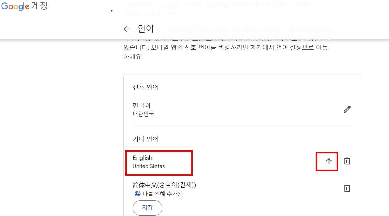 3) 보통 한국어로 되어 있을텐데 영어가 없으면 영어를 찾아서 저장 한 후 화살표를 위로 올리면 웹 환경이 영어로 저절로 바뀌어집니다.