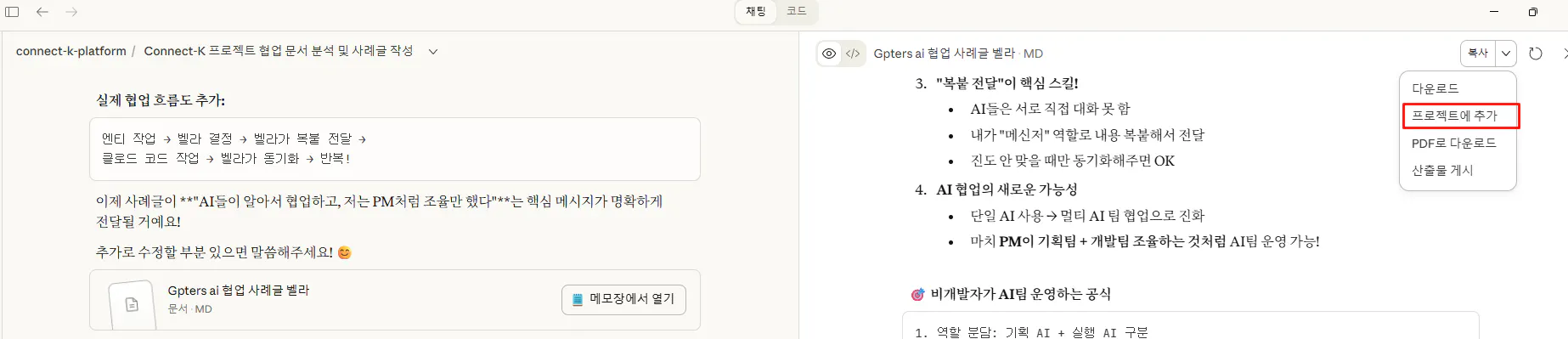 사례 B: "Connect-K AI 협업 개발 워크스루" 는 이렇게 탄생했어요