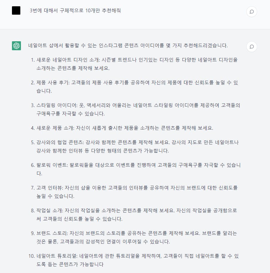 네일아트 쪽은 도메인 지식이 없다보니 설명할 때 항상 콘텐츠 소재 쪽에서 막혀서 마침 궁금하던 차에 콘텐츠에 대한 소재 10가지를 뽑아달라고 하니 소름돋는 창의적인 소재를 던져주기 시작함.