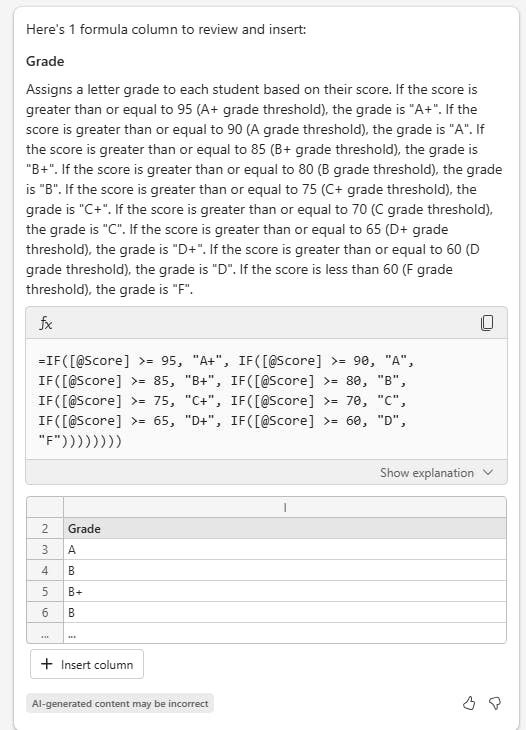 [Insert column] 버튼을 누르면 I열에 Grade를 삽입합니다.