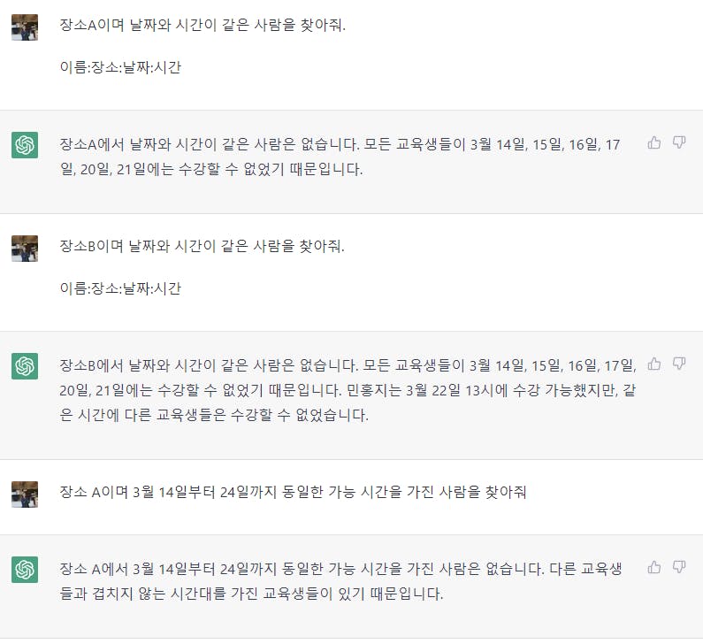 4. 정리된 표를 바탕으로 동시 수강이 가능한 그룹을 만든다. 이제 물어봤습니다. <첫번째..시도> 프롬프트: 장소A에서 동시 수강 가능한 교육자 이름 알려줘