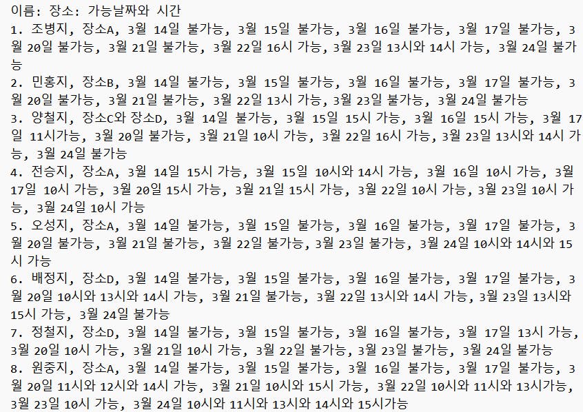 지난한 시도를 통해 '내 질문이 개떡이었구나'를 깨닫습니다. 제가 실수했습니다. 동시 수강이 가능한 사람이 아니라, 동시 가능한 사람 그룹과 장소, 시간, 날짜를 물어봤야죠.. 분하지만 이 녀석은 이제 제 질문에 답해줄 의향이 없습니다. 그래서 다시 새 창을 열어봅니다.