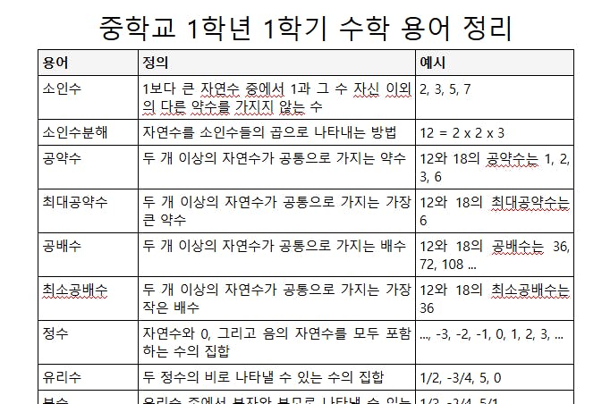 1학년 학생들에게 수학의 용어부터 가르치려고 해. 중학교 1학년 1학기에는 "소인수분해", "정수와 유리수", "문자와 식", "좌표평면과 그래프" 를 배워.