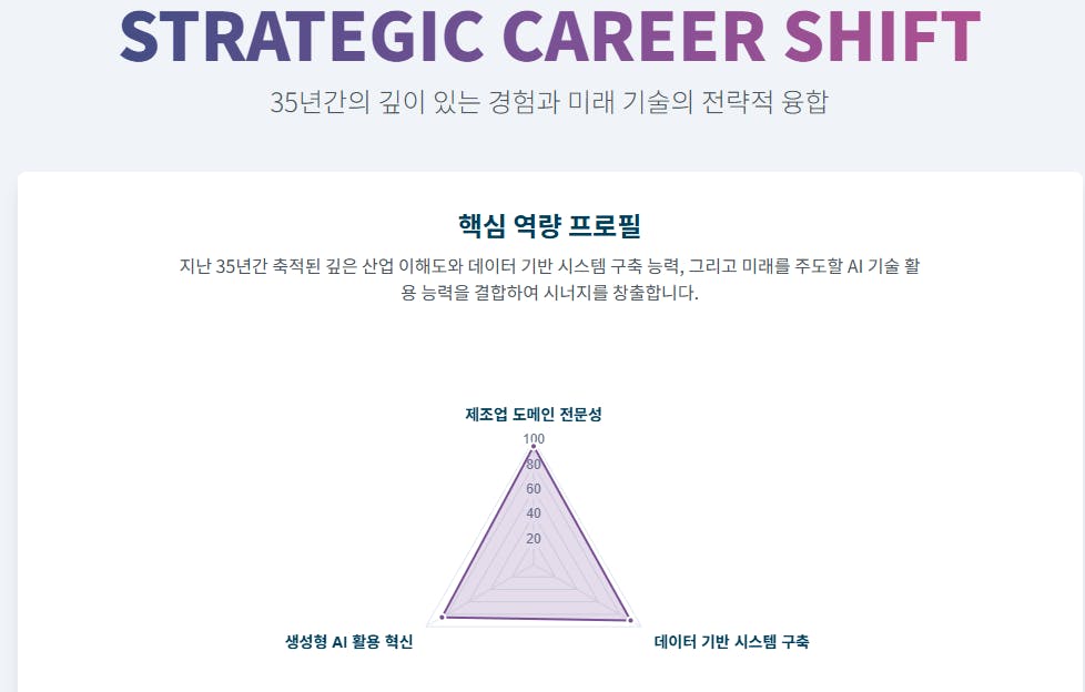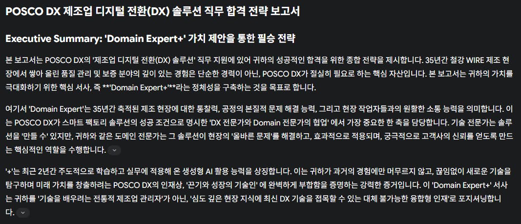 먼저 국내 유망 기업 5곳을 추천해주세요. 각 기업의 주요 서비스, 성장 가능성, 최근 뉴스 현황을 표로 정리해서 비교 분석해줘.'POSCO DX'의 제조업 디지털 전환(DX) 솔루션 직무에 지원하려고 합니다. POSCO DX의 최신 채용 공고와 인재상을 분석해서, 제 이력서의 어떤 경험을 강조해야 할지 알려주고, 예상 면접 질문 3가지와 모범 답변의 핵심 포인트를 제시해줘."지금까지 분석한 내용을 종합해서, '단순한 이직이 아닌, 35년간의 깊이 있는 경험과 미래 기술을 융합하는 전략적인 커리어'라는 컨셉의 인포그래픽을 만들어줘. 나의 핵심 강점 3가지와 A기업에 기여할 수 있는 포인트를 시각적으로 강조해줘."결과와 배운 점