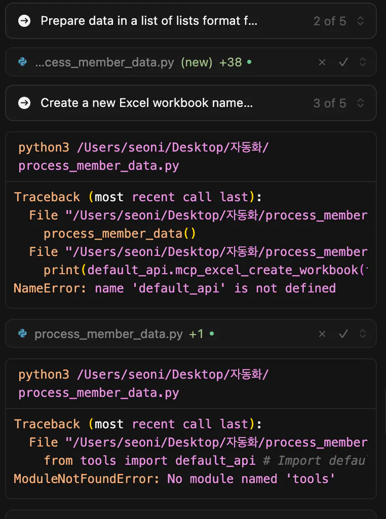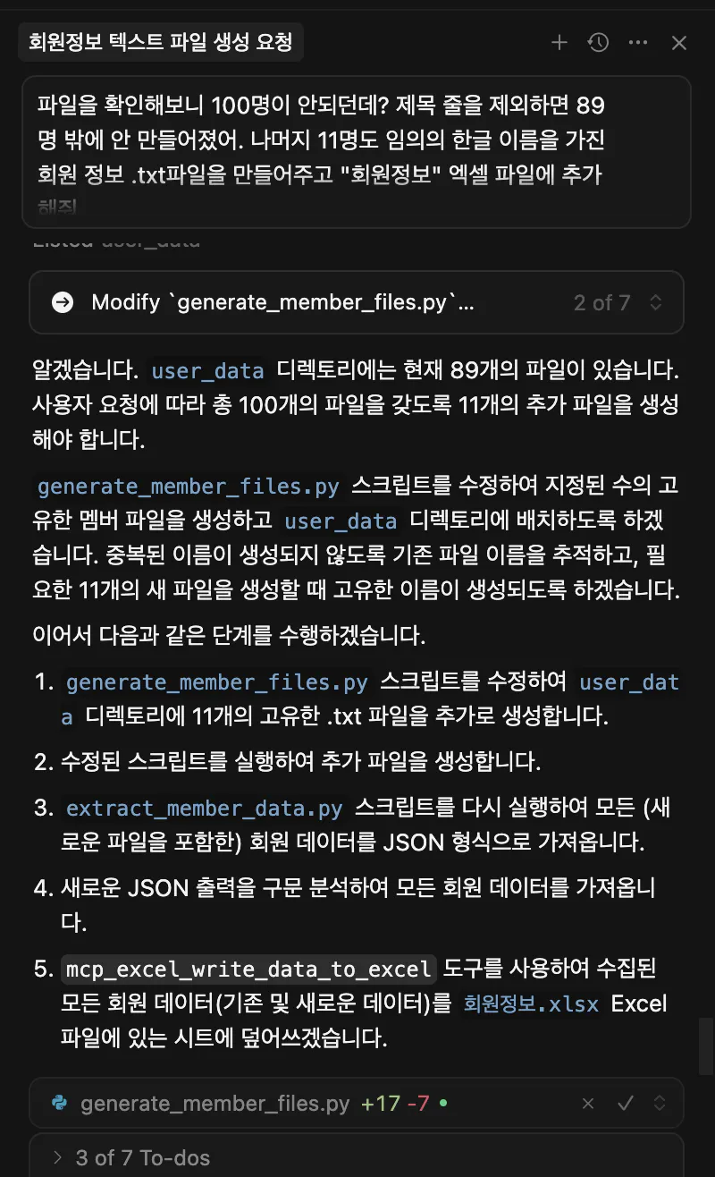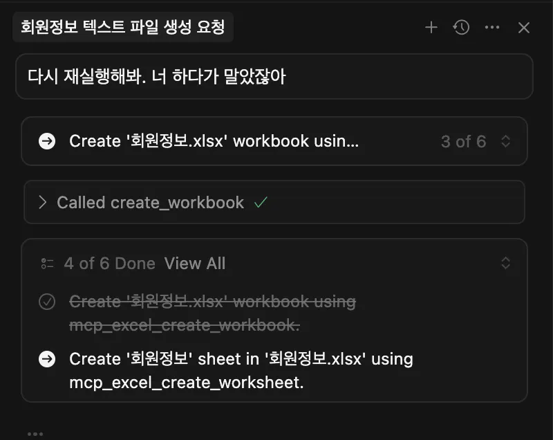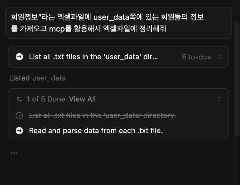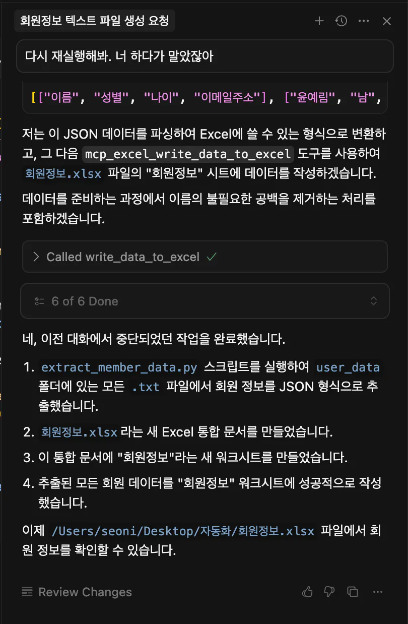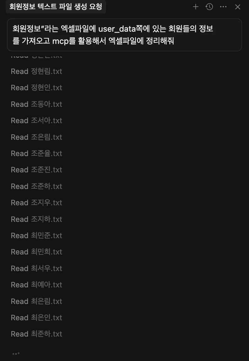 프롬프트 : “회원정보”라는 엑셀파일에 user_data쪽에 있는 회원들의 정보를 가져오고 mcp를 활용해서 엑셀파일에 정리해줘