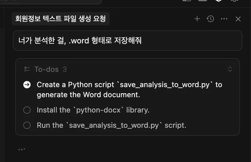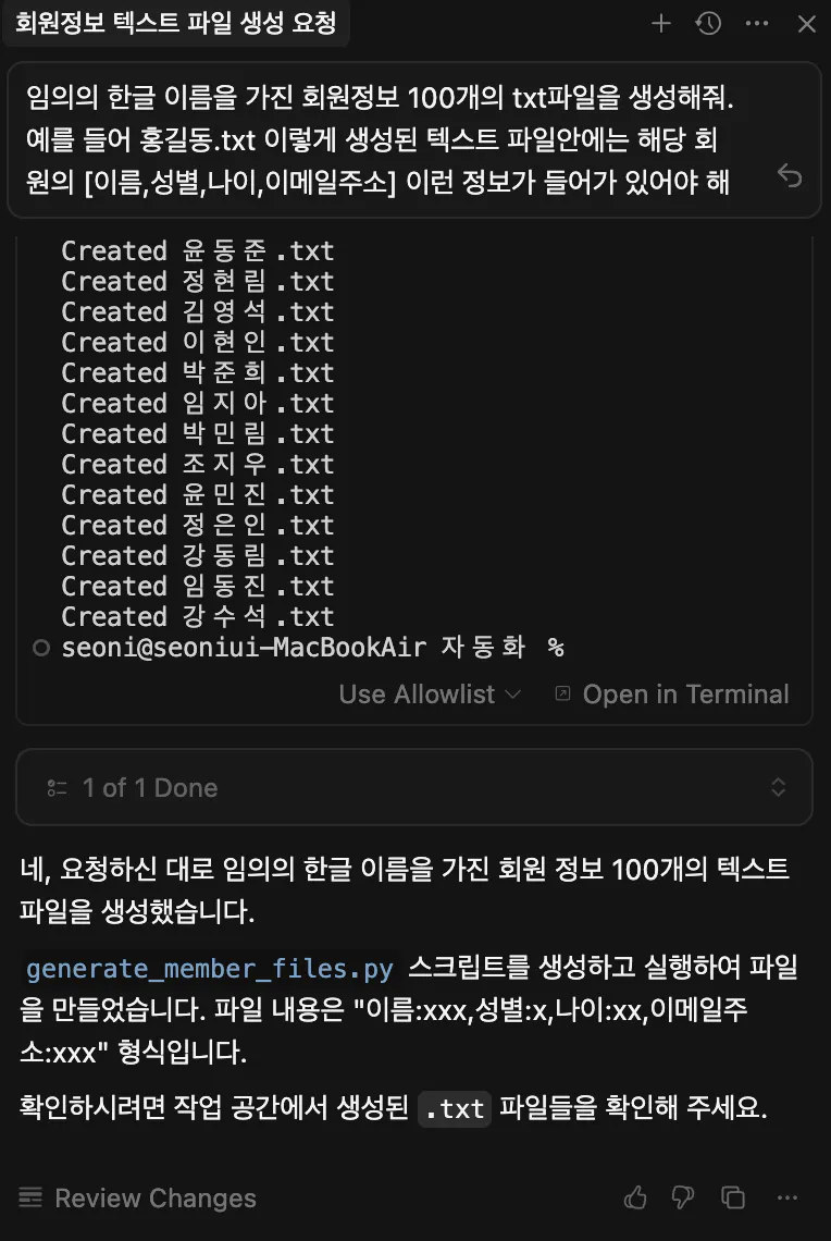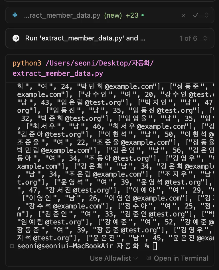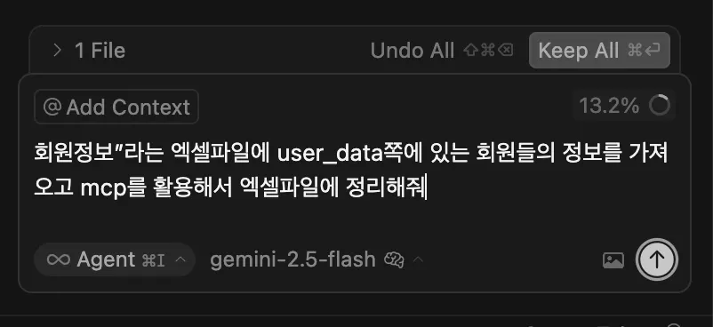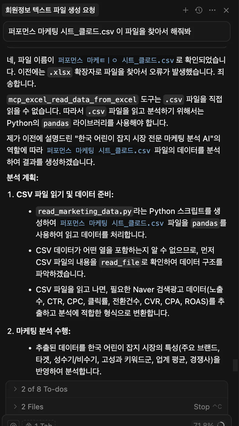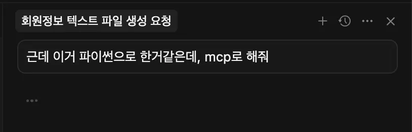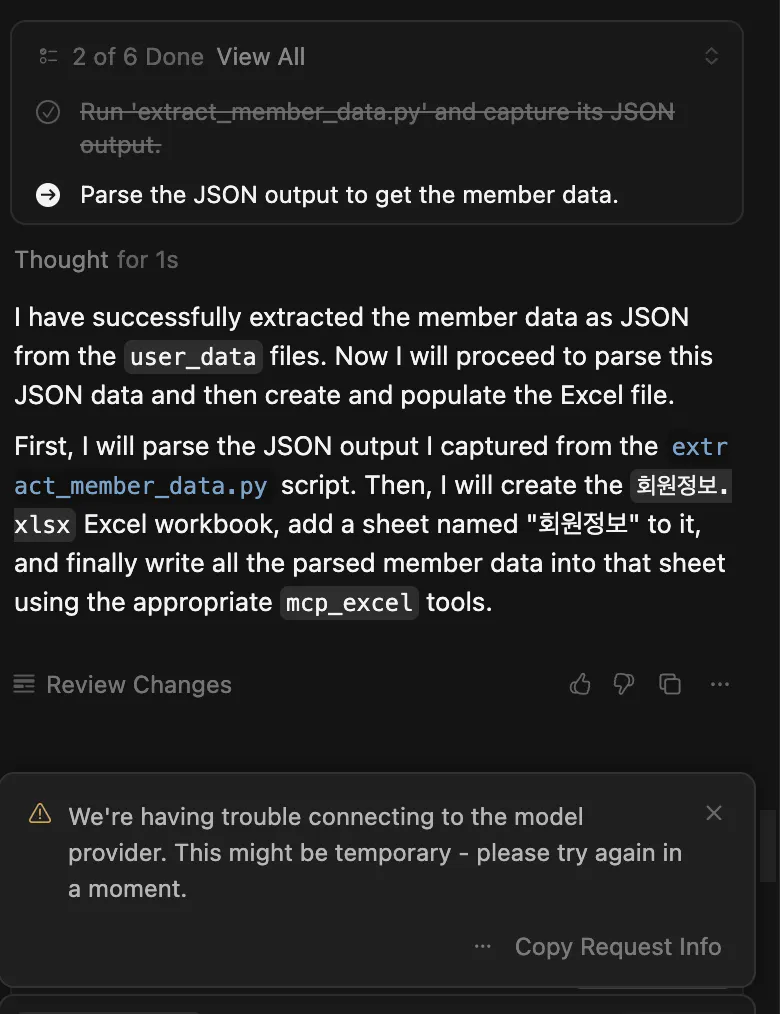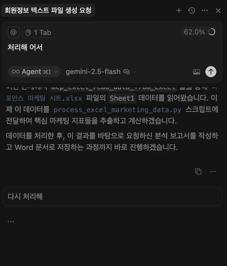 프롬프트 : “회원정보”라는 엑셀파일에 user_data쪽에 있는 회원들의 정보를 가져오고 mcp를 활용해서 엑셀파일에 정리해줘