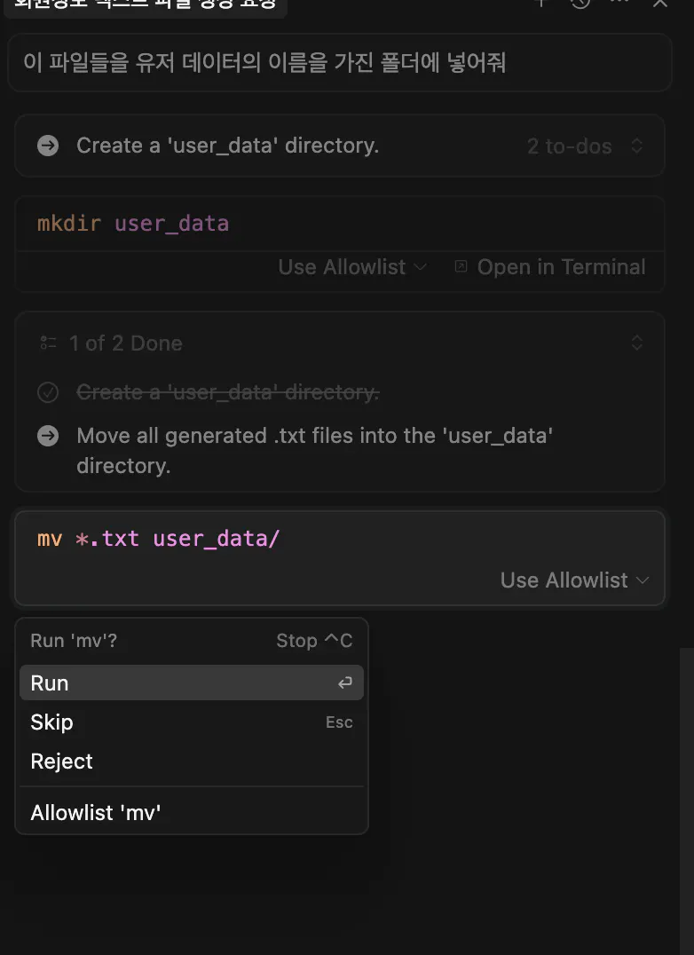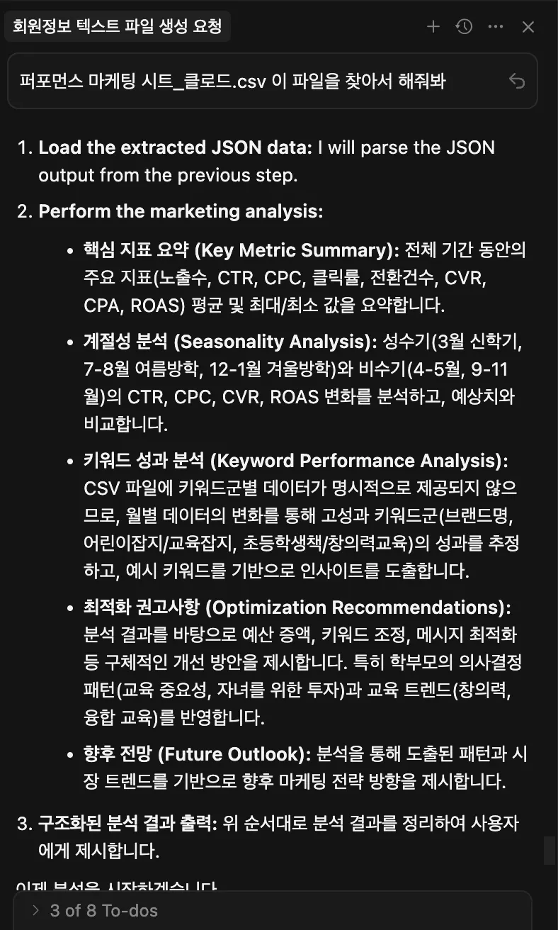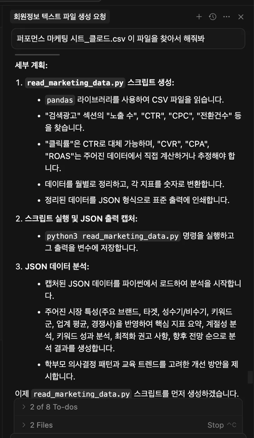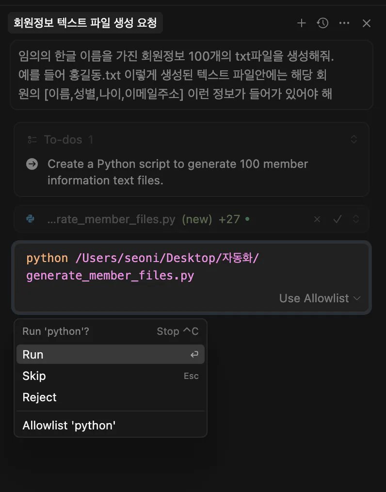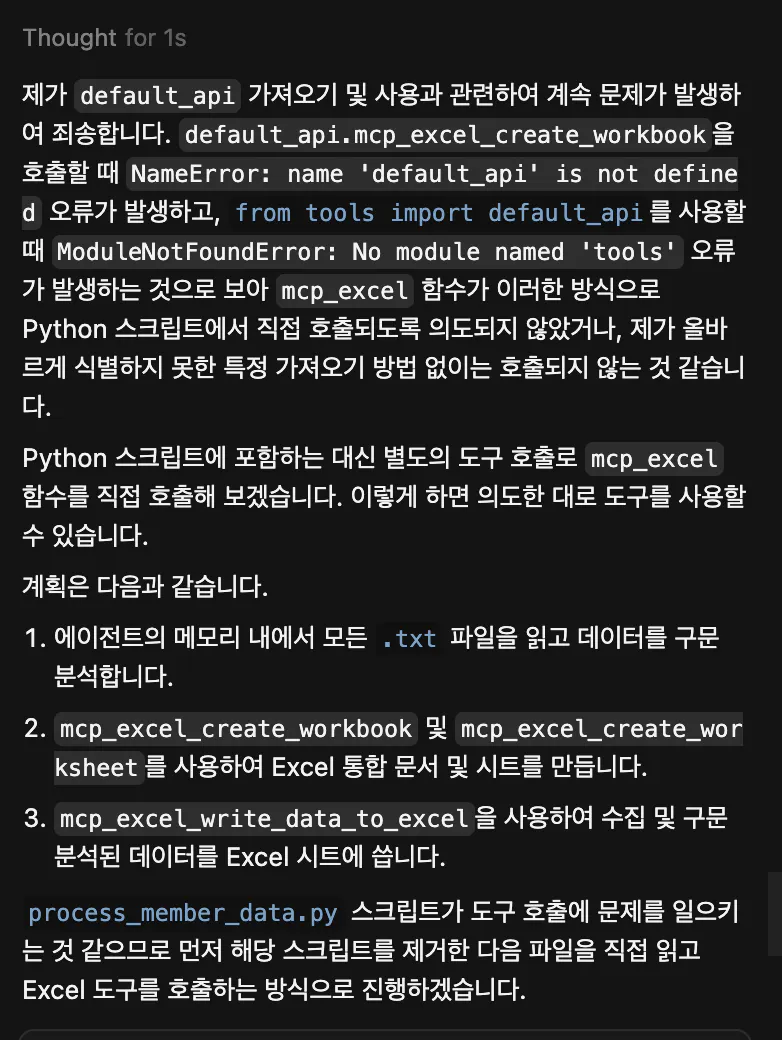 프롬프트 : “회원정보”라는 엑셀파일에 user_data쪽에 있는 회원들의 정보를 가져오고 mcp를 활용해서 엑셀파일에 정리해줘