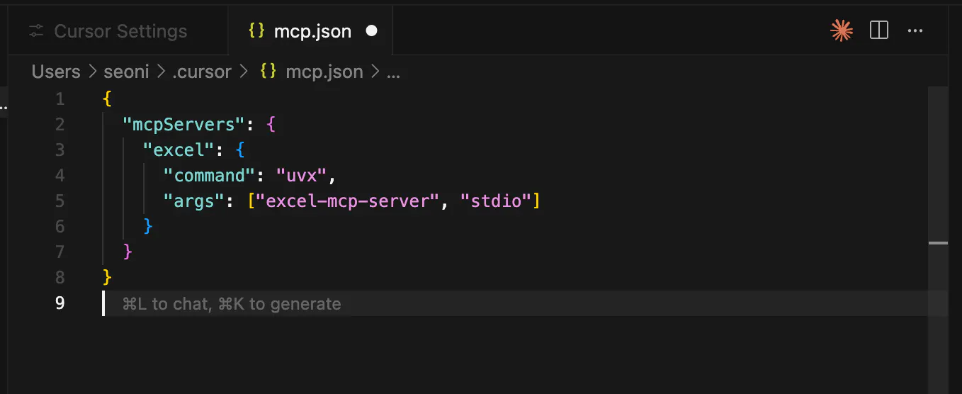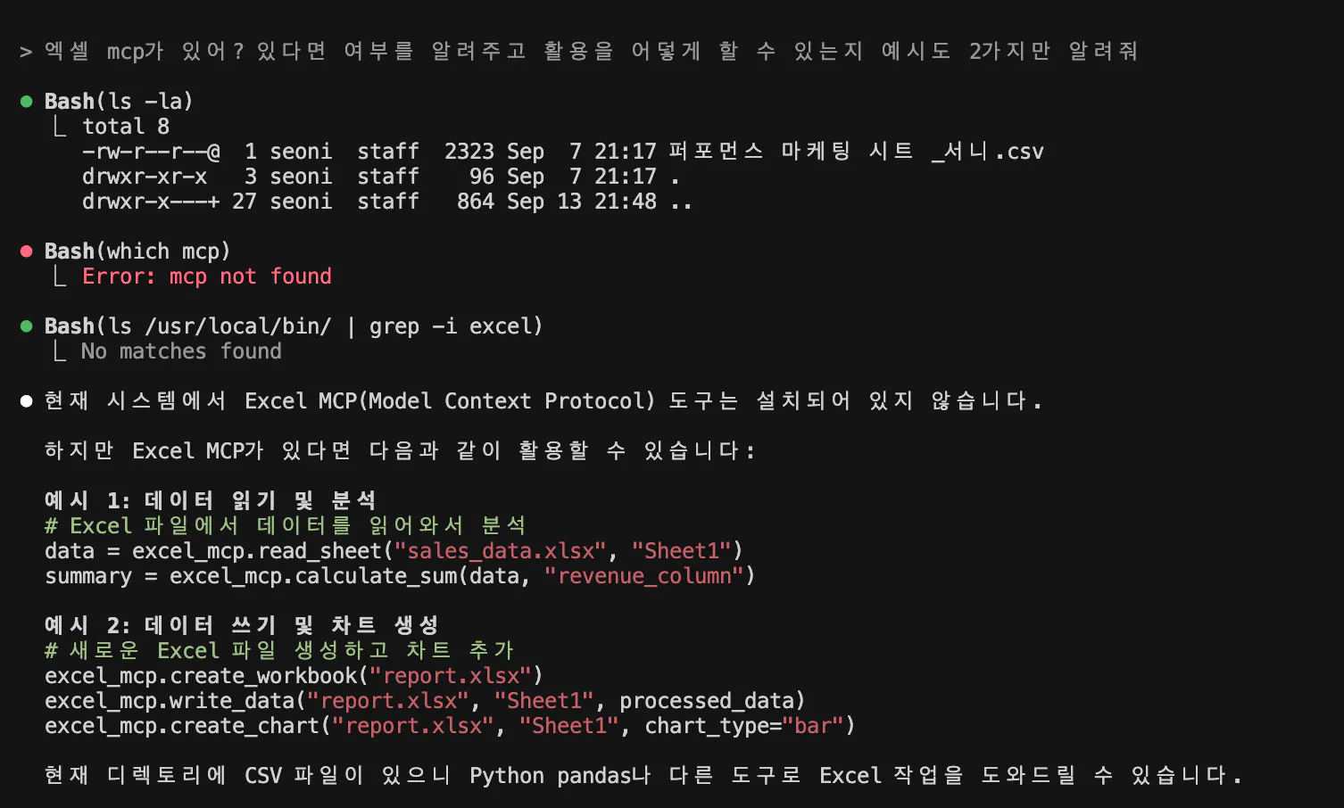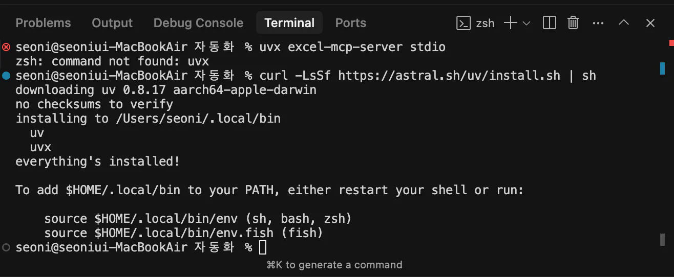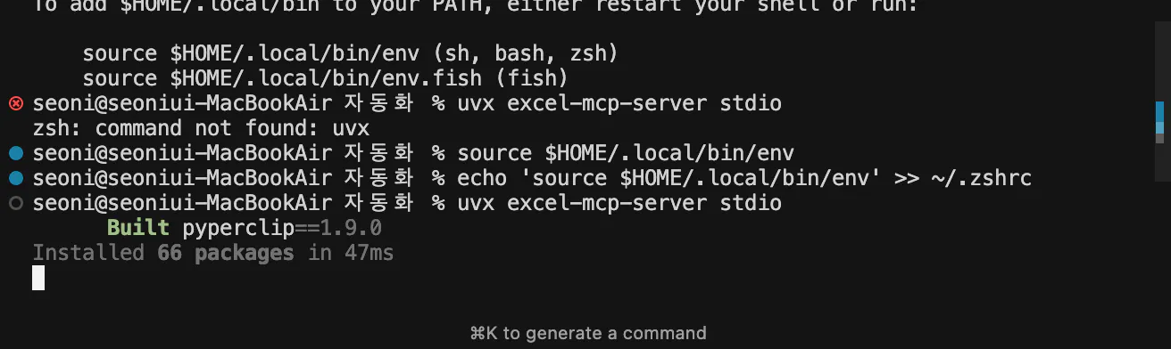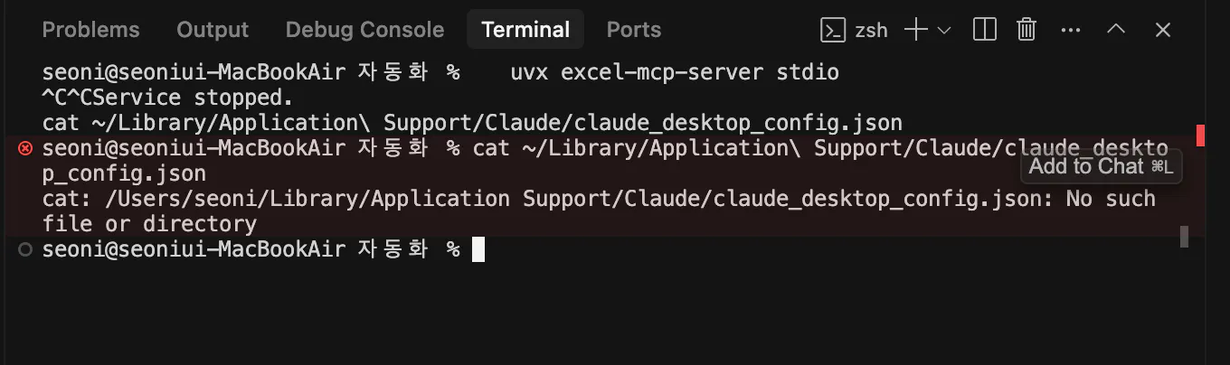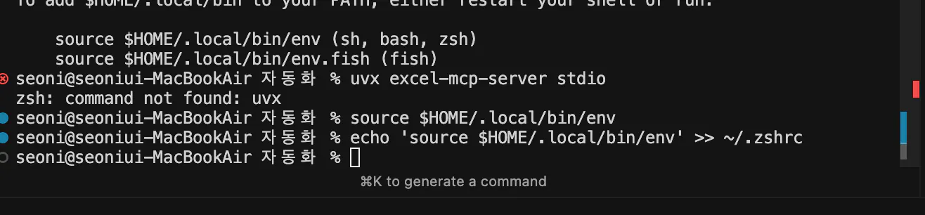 2. 절대 경로로 설정 파일 수정:cat > ~/Library/Application\ Support/Claude/claude_desktop_config.json << 'EOF' { "mcpServers": { "excel": { "command": "/Users/seoni/.local/bin/uvx", "args": ["excel-mcp-server", "stdio"] } } } EOF