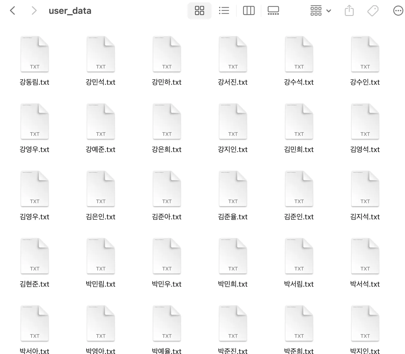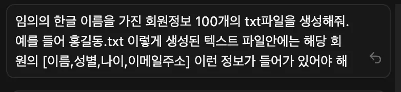 프롬프트: 임의의 한글 이름을 가진 회원정보 100개의 txt파일을 생성해줘. 예를 들어 홍길동.txt 이렇게 생성된 텍스트 파일안에는 해당 회원의 [이름,성별,나이,이메일주소] 이런 정보가 들어가 있어야 해