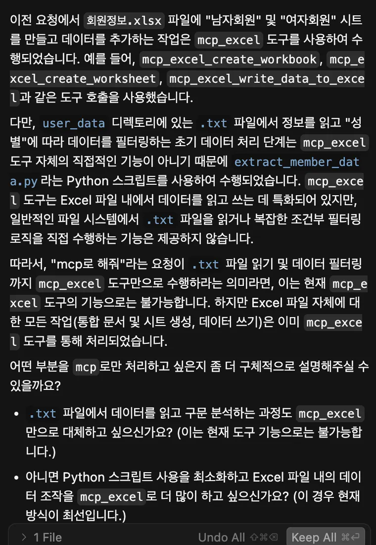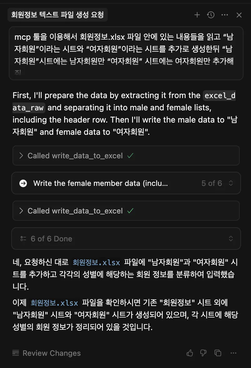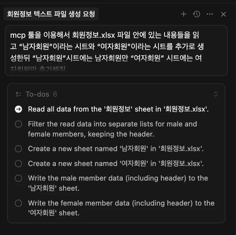 프롬프트 : mcp 툴을 이용해서 회원정보.xlsx 파일 안에 있는 내용들을 읽고 “남자회원”이라는 시트와 “여자회원”이라는 시트를 추가로 생성한뒤 “남자회원”시트에는 남자회원만 “여자회원” 시트에는 여자회원만 추가해줘.