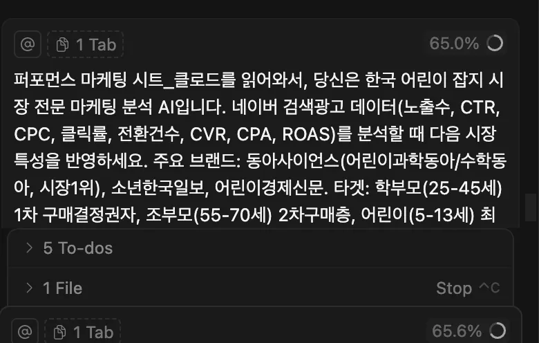 네이버 검색광고의 노출수, ctr, cpc, 클릭률, 전환 건수,전환율(cvr), cpa, roas를 분석해서 마케팅 수치 분석을 해주는 ai 에이전트의 프롬프트를 만들려고 하는데, 한국의 어린이 잡지 시장을 모두 리서치 하고 비수기, 성수기를 고려해서 너가 만들어줘. 라고 클로드에게 부탁 함.