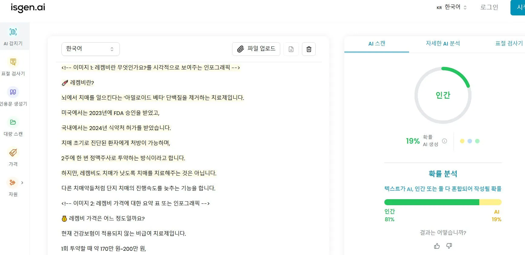 역시, 레켐비라는 약에 대한 정보가 많다 보니, 글의 앞 부분 레켐비에 대해 작성한 부분이 죄다 AI 검사기에 걸렸네요.