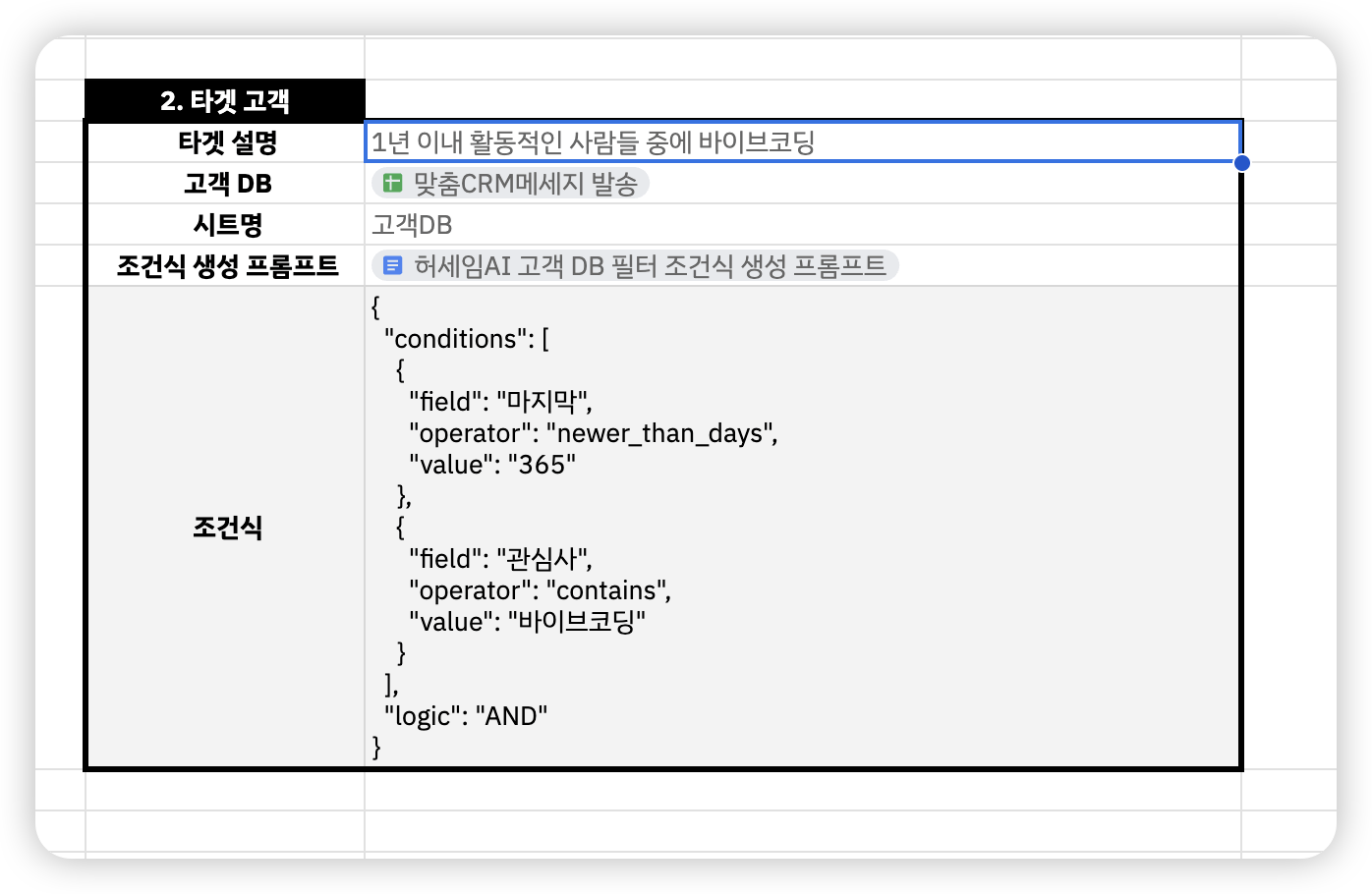 핵심은 text 2 SQL. 자연어로 디비 쿼리를 만드는 부분입니다. 자연어를 코드가 이해할 수 있는 JSON으로 변환해주니까, 비개발자도 "3개월 이상 연락 안 한 고객"이라고만 쓰면 AI가 알아서 조건식을 만들어주거든요.