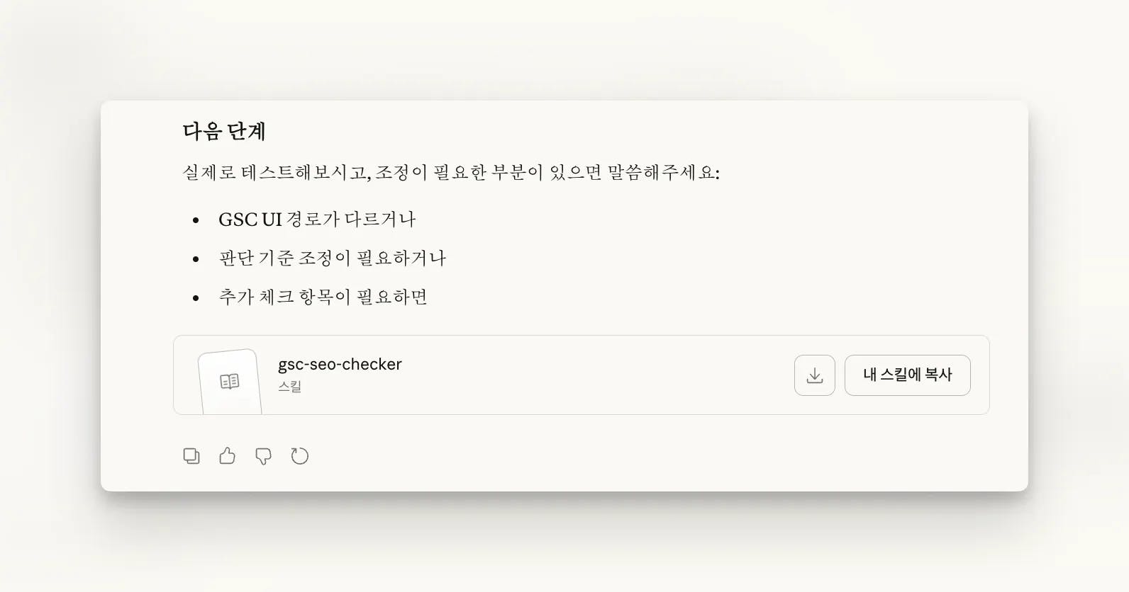 아무튼, Claude와 함께 구글 서치 콘솔의 SEO 문제를 찾아주는 ClaudeSkill을 만들었습니다. 이걸 다운로드해서 ClaudeSkill로 이용할 수 있습니다.