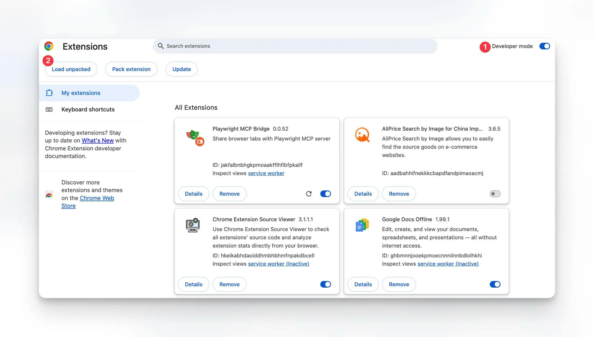 여기서 Playwright MCP Extension을 다운로드 할 수 있습니다. 그런 다음 chrome://extensions/ 에서 1) Developer mode를 활성화하고 2) Load unpacked에서 파일을 업로드하여 크롬 익스텐션을 사용할 수 있습니다.